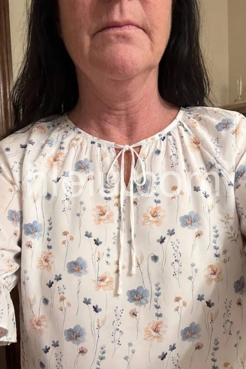 This loose-fit top features a delicate floral print on a soft white base. Keyhole neckline with front tie adds a romantic touch. Three-quarter ruffle sleeves enhance the boho charm. Lightweight and perfect for spring or summer. Effortlessly stylish with jeans or skirts.