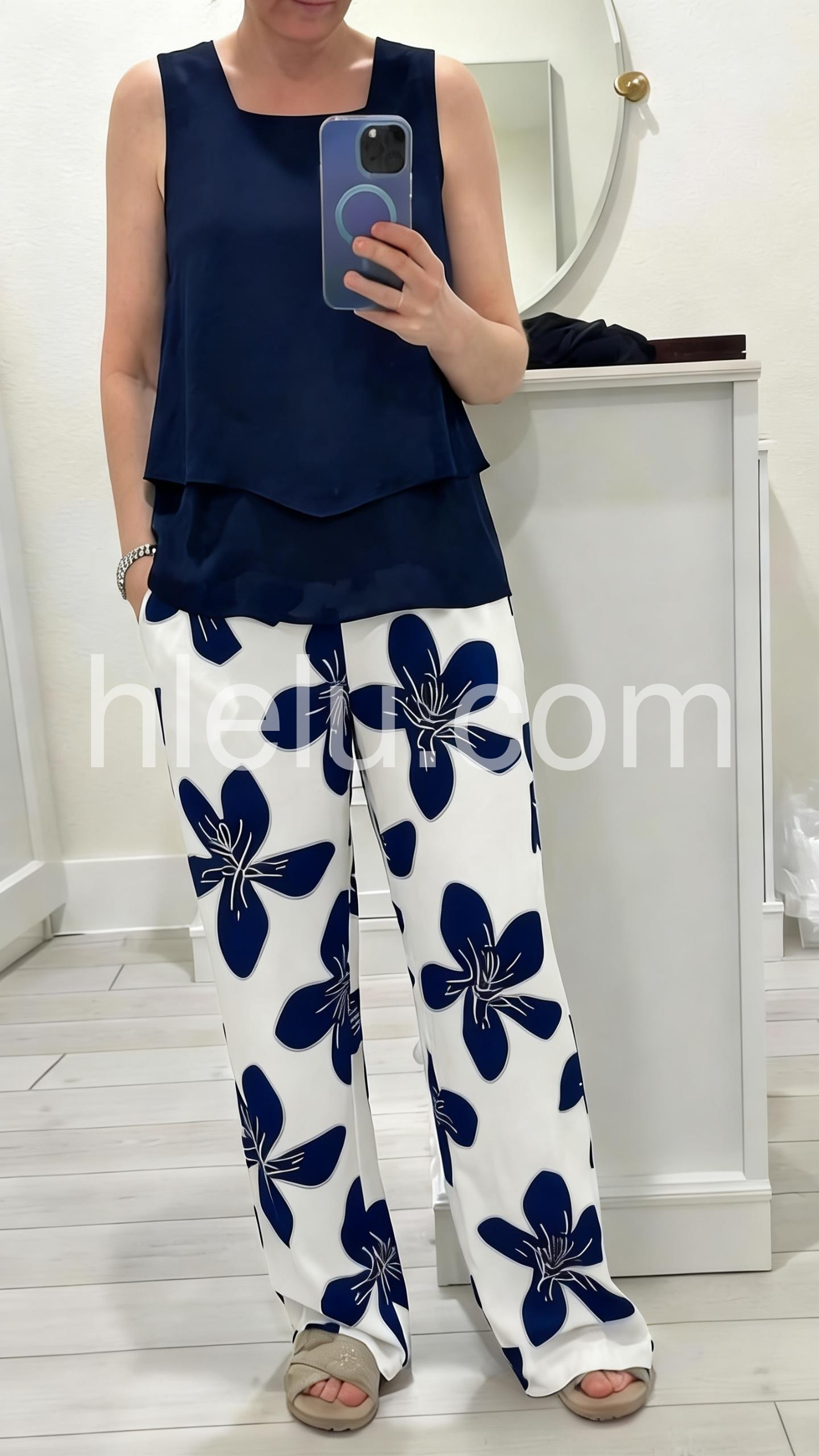 This coordinated set features a navy sleeveless top with a layered hem and wide-leg pants in white with bold navy floral prints. Comfortable and stylish for casual outings or summer days. Lightweight fabric ensures ease of movement. Perfect for beachside looks or relaxed weekends. Effortlessly chic with a modern touch.