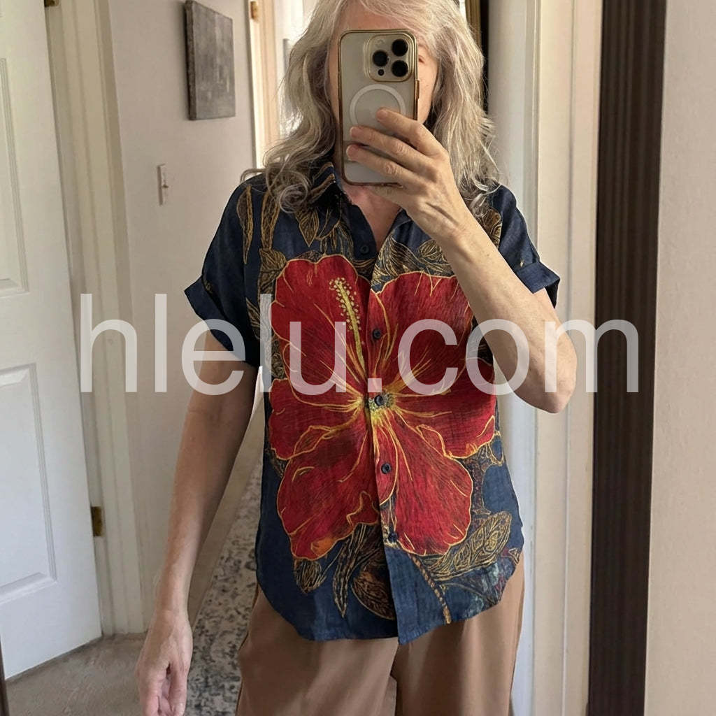 Channel island vibes with this Bold Tropical Hibiscus Print Top, a vibrant statement piece that brings the essence of paradise to your wardrobe. Crafted from lightweight, breathable fabric—likely cotton or linen blend—it features a rich navy base adorned with a striking oversized red hibiscus flower outlined in golden yellow, complemented by intricate leafy patterns throughout. The classic short-sleeve shirt design includes a relaxed fit, button-down front, and rolled sleeves for an effortless, laid-back look. Perfect for pairing with denim jeans, high-waisted shorts, or flowy skirts, this top is ideal for beach days, tropical getaways, or summer city strolls. Its bold floral motif exudes bohemian charm and exotic flair, making it a standout choice for those who love fashion with personality. Inspired by the playful, romantic styles found on sites like Lulus, this shirt effortlessly blends artistry and comfort—ideal for adding a splash of color and confidence to your warm-weather wardrobe.