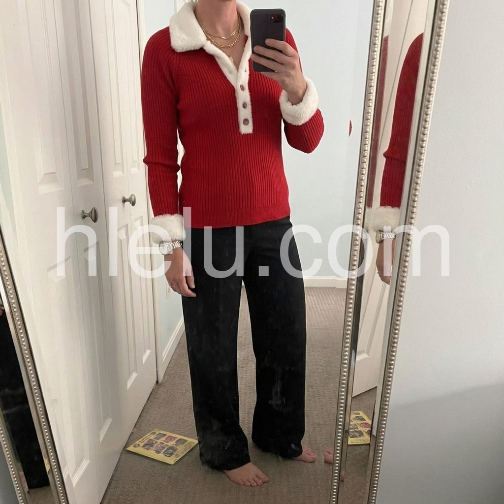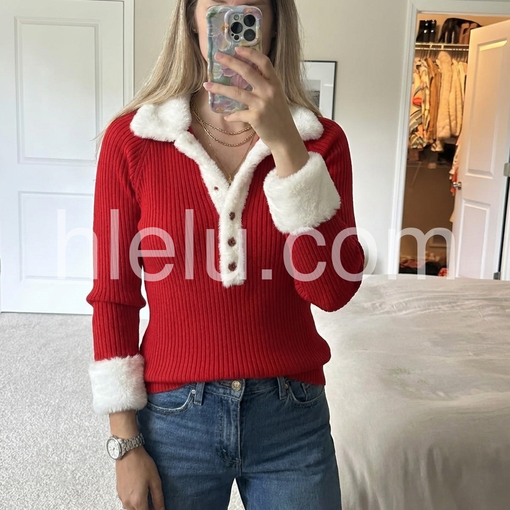 This red ribbed top features a striking color block design and a faux fur trim that adds a touch of luxury to everyday wear. Equipped with button-front closure, it allows for versatile styling and easy layering. The ribbed fabric offers a comfortable, form-fitting silhouette, making it ideal for both casual and polished looks.