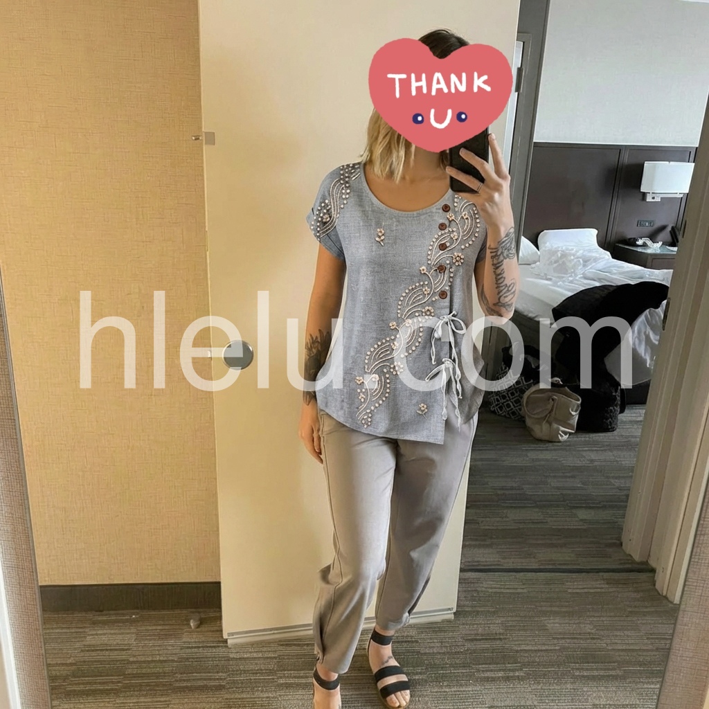 This blouse blends artisanal detail with feminine charm. The muted gray base, adorned with delicate floral and dot embroidery, evokes timeless sophistication.