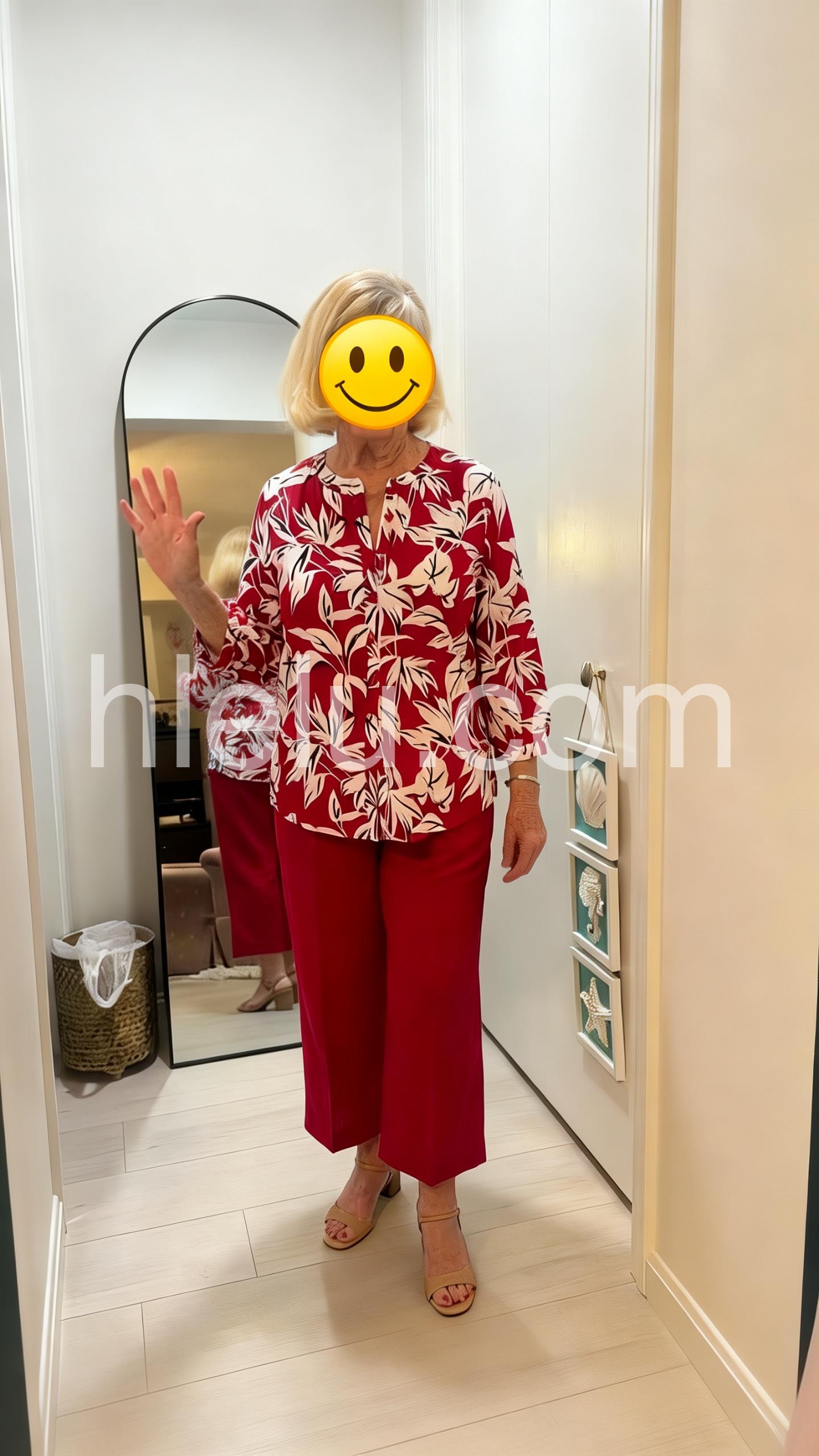 This coordinated set features a vibrant red blouse with white leaf print and button-front detail. Paired with matching cropped pants for a polished look. The three-quarter sleeves add a touch of elegance. Perfect for casual outings or warm-weather events. Confident, chic, and easy to wear.