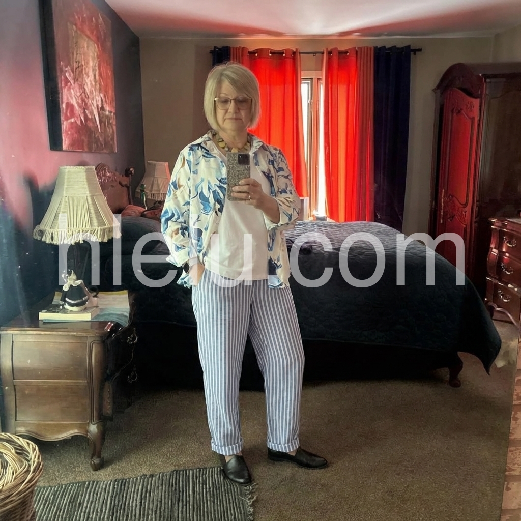 These relaxed-fit pants feature vertical blue and white stripes with a casual, breezy silhouette. Elastic waistband and side pockets for comfort. Cuffed hems add a stylish touch. Perfect for beach days or everyday wear. Lightweight fabric ideal for warm weather.