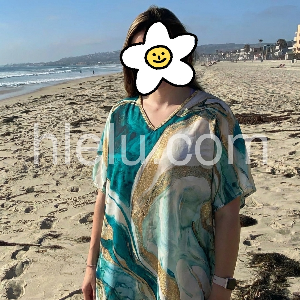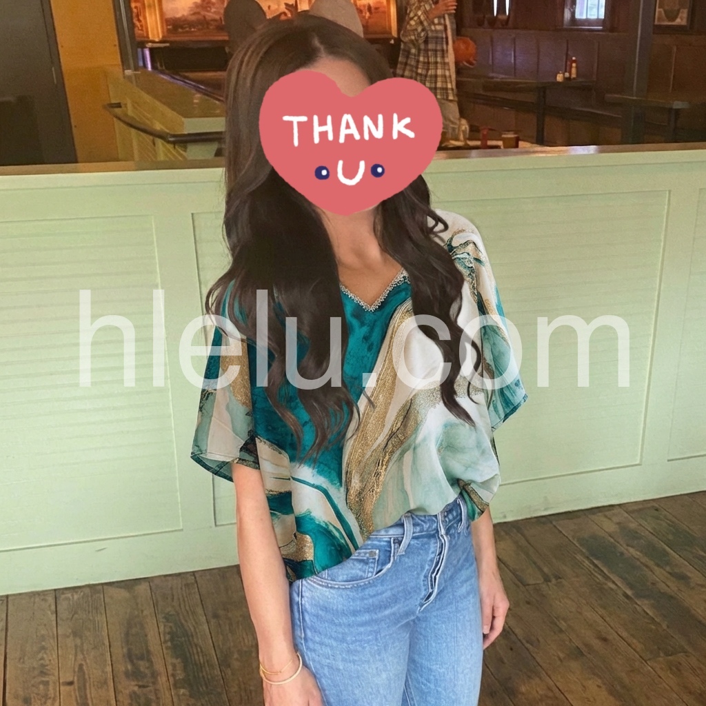 This loose-fitting top features a bold emerald, gold, and cream abstract design. V-neckline with delicate trim for added detail. Wide sleeves and relaxed silhouette for effortless comfort. Perfect for warm days or beachwear. Stylish and easy to pair with pants or shorts.
