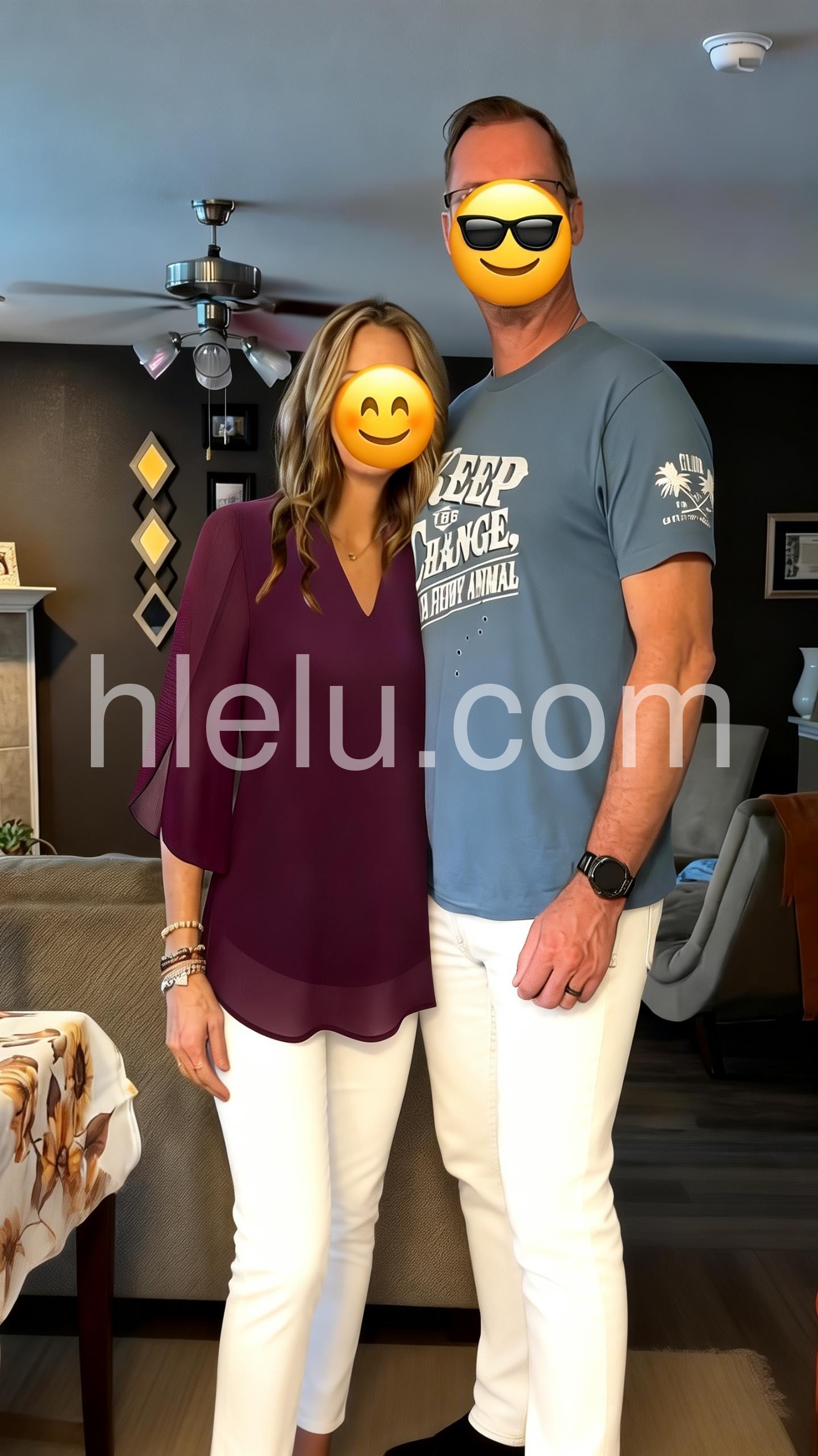 This V-neck blouse features a lightweight, sheer chiffon fabric with a soft drape. The three-quarter flutter sleeves add a feminine touch. Perfect for pairing with pants or jeans. Ideal for casual outings or dressy occasions. Effortlessly stylish and comfortable.