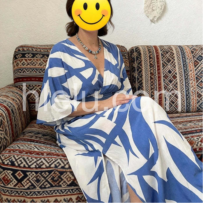 The Blue Print Long Sleeve Maxi Dress brings a beautiful, bold style to any special occasion. The slim-fitting silhouette shows off your shape without sacrificing comfort. The 3/4 sleeves and full skirt create an elegant look that will impress. Crafted from a lightweight fabric, it's the perfect complement to your wardrobe.