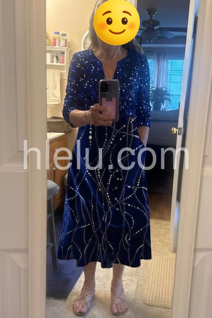 A royal blue and cobalt shade intermingle on this long summer dress covered in white line streaks and dots reminiscent of constellations. A button-front round collar v-neckline, three-quarter length sleeves, and flared midi dress silhouette keep it versatile, finished with side pockets. Pair it with flats, heels, a black or brown leather jacket, and hoops. Machine wash cold tumble dry low to medium heat. Iron if needed or lay flat to dry.