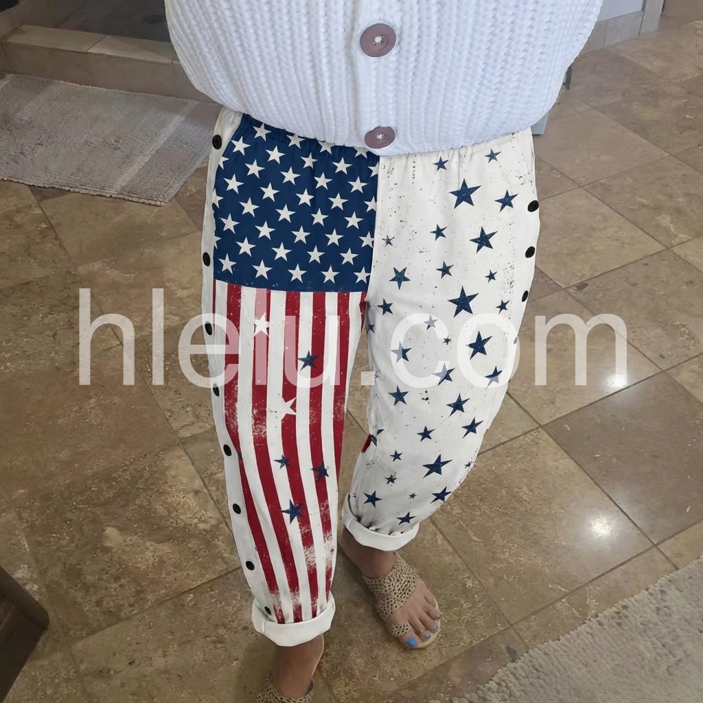 These loose-fit pants feature a bold American flag print with stars and stripes on one leg. Side button details add a unique touch. Elastic waistband and cuffed hems for comfort. Lightweight fabric perfect for casual wear. Ideal for summer outings or festive occasions.