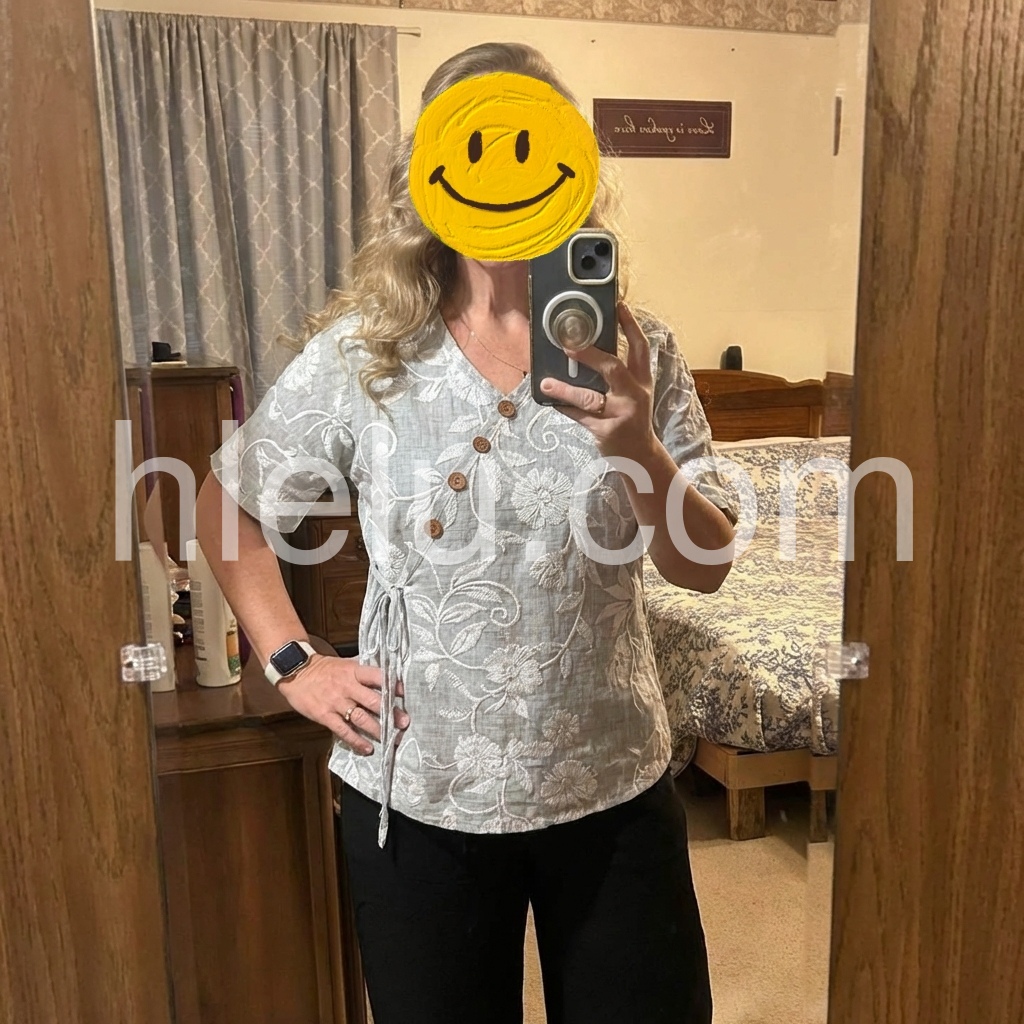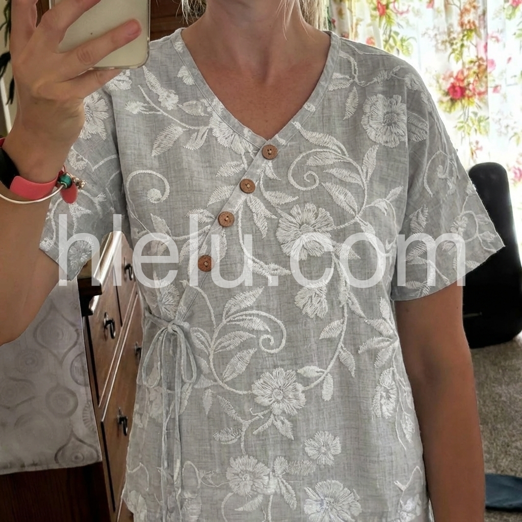 This short-sleeve top features a soft gray base with white floral print. V-neckline with wooden buttons and side tie detail. Relaxed fit for all-day comfort. Lightweight fabric perfect for casual wear. Ideal for pairing with jeans or pants.