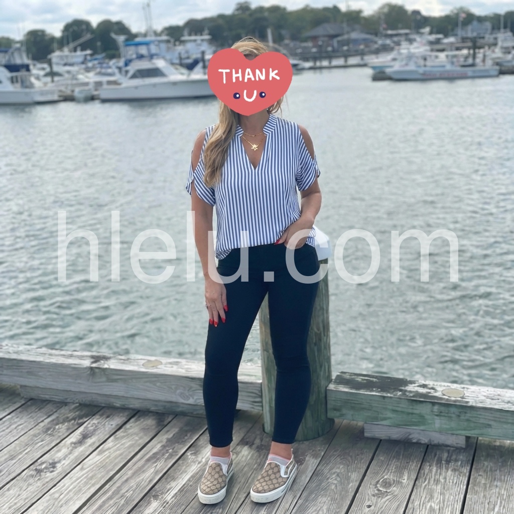 This short sleeve top features vertical blue and white stripes. Collar design with a V-neckline for a polished look. Cut-out shoulders add a trendy touch. Lightweight fabric perfect for summer wear. Ideal paired with jeans or shorts.
