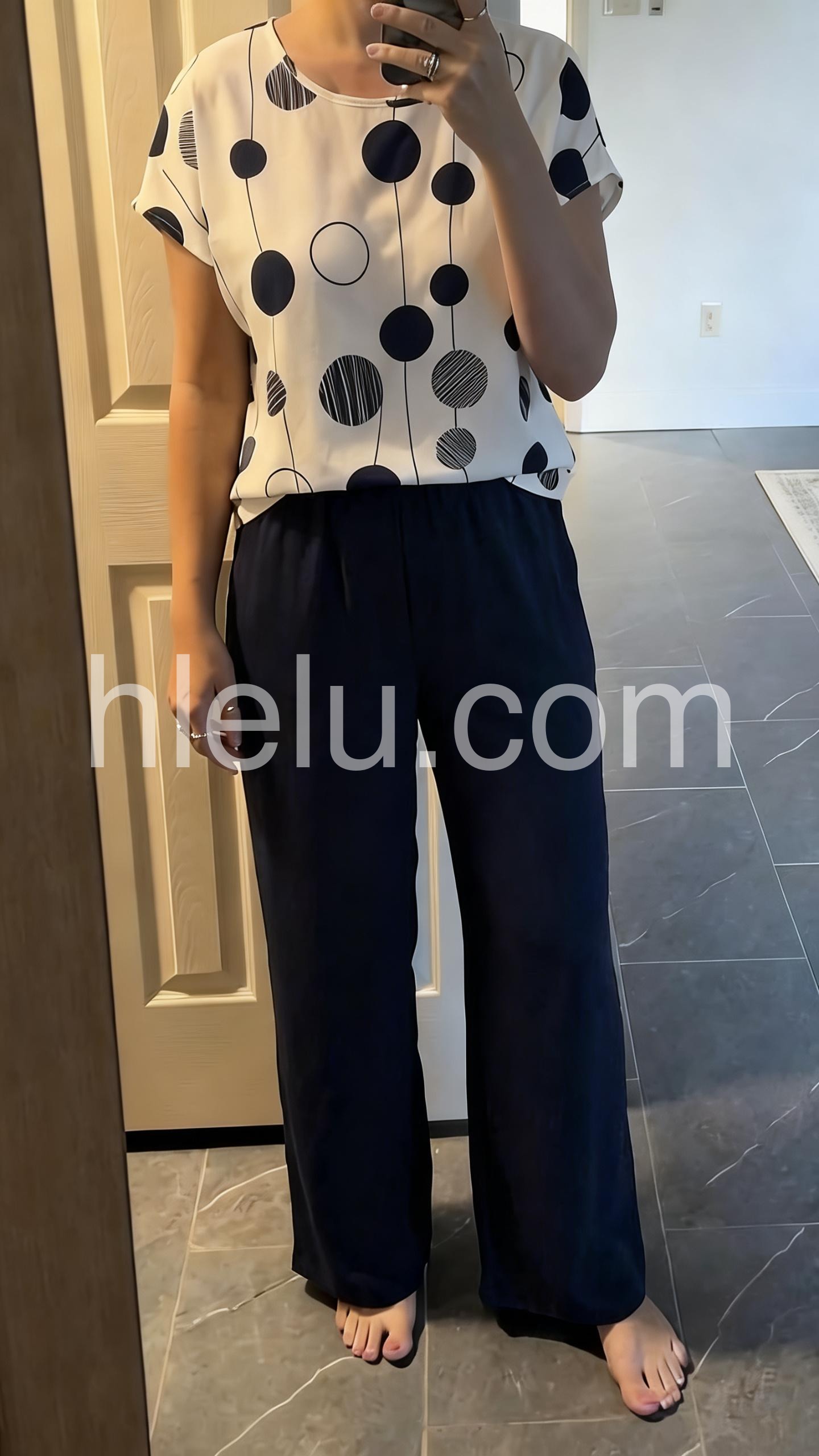 This coordinated outfit features a white top with abstract navy polka dots and relaxed fit. Paired with high-waisted, wide-leg navy pants for a chic silhouette. Lightweight and comfortable for everyday wear. Perfect for casual outings or warm-weather style. Effortlessly stylish with a minimalist touch.