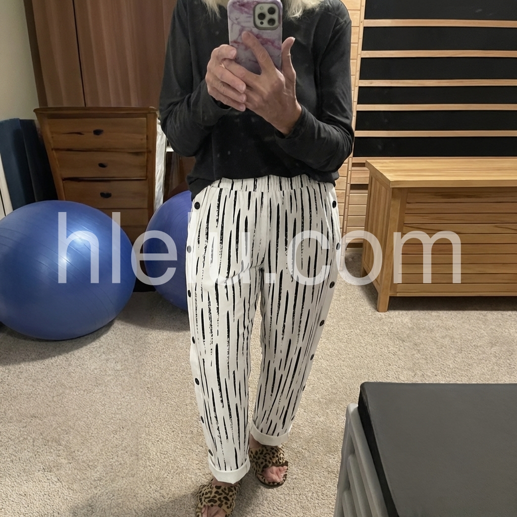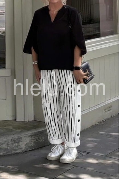 These relaxed-fit pants feature a bold black abstract stripe print on a white base. Elastic waistband and cuffed hems offer a cozy, stylish look. Side button details add a unique touch. Lightweight fabric perfect for casual wear. Effortlessly chic with a contemporary edge.