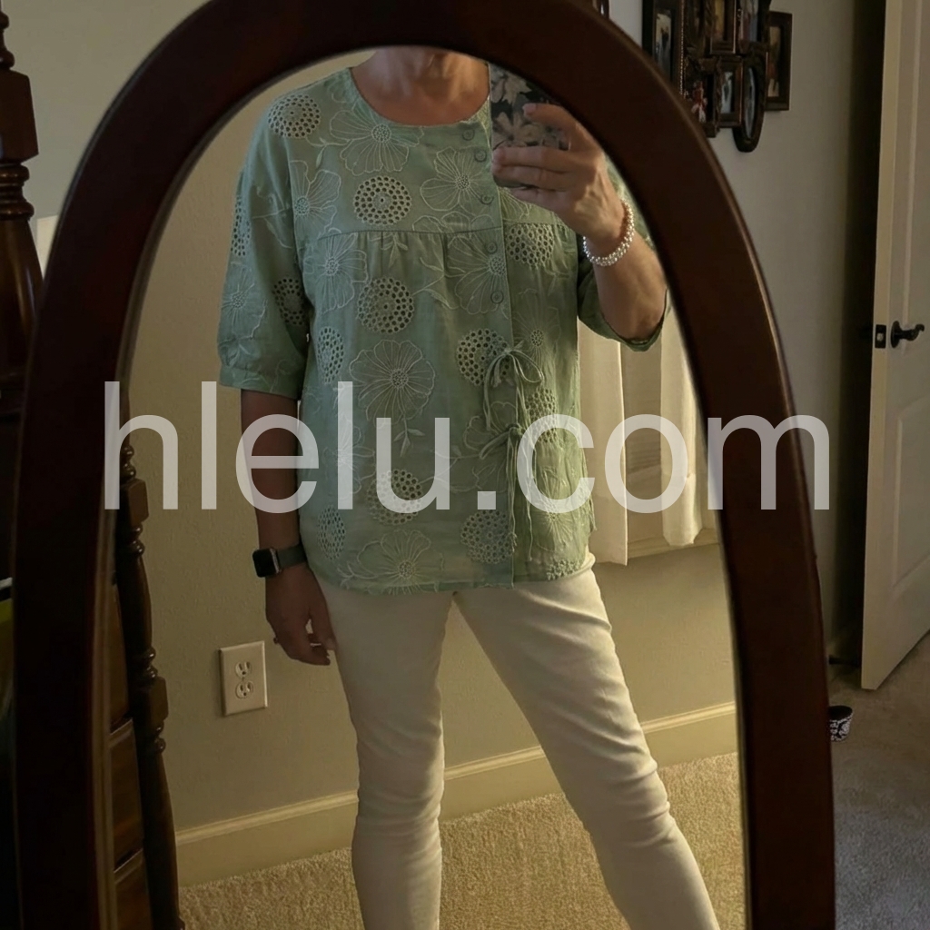 Created to refresh everyday basics, this embroidered blouse solves the problem of “boring work tops” with delicate floral cutwork. The intricate embroidery adds texture and visual interest, elevating simple jeans or trousers.