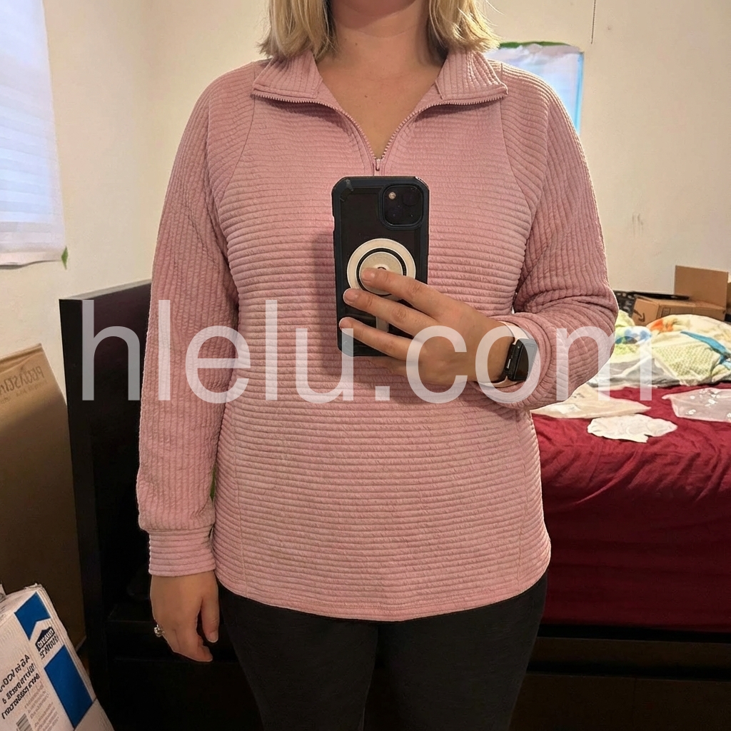 This dusty pink half-zip sweatshirt is my new favorite casual piece! The ribbed texture feels so soft and structured, not bulky at all. The quarter-zip neckline is perfect for adjusting warmth, and the relaxed fit drapes beautifully over jeans. I wore it all day running errands and it stayed comfortable, no scratchy fabric. The muted pink is such a chic, wearable color—goes with everything in my closet!