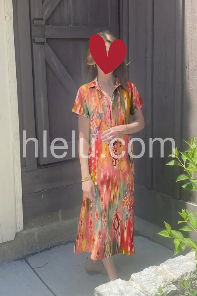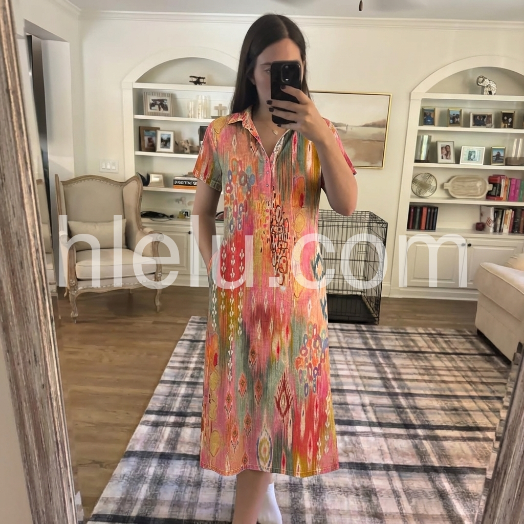 This mid-length shirt dress features a bold ikat pattern in warm reds, pinks, and earthy tones. With short sleeves, a button-down front, and relaxed fit for comfort. Perfect for summer days or casual outings. Pair with sandals for a laid-back, stylish look. Effortlessly elegant with global flair.