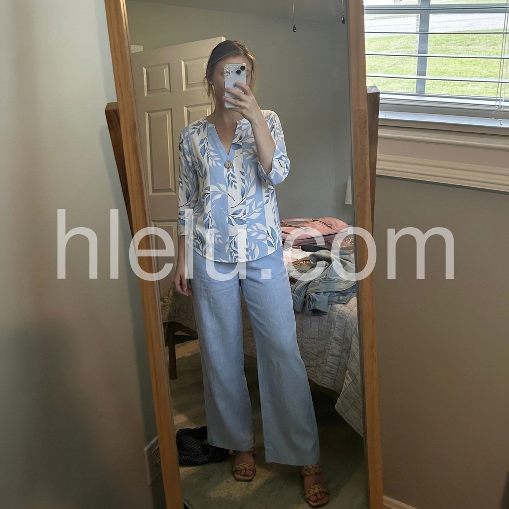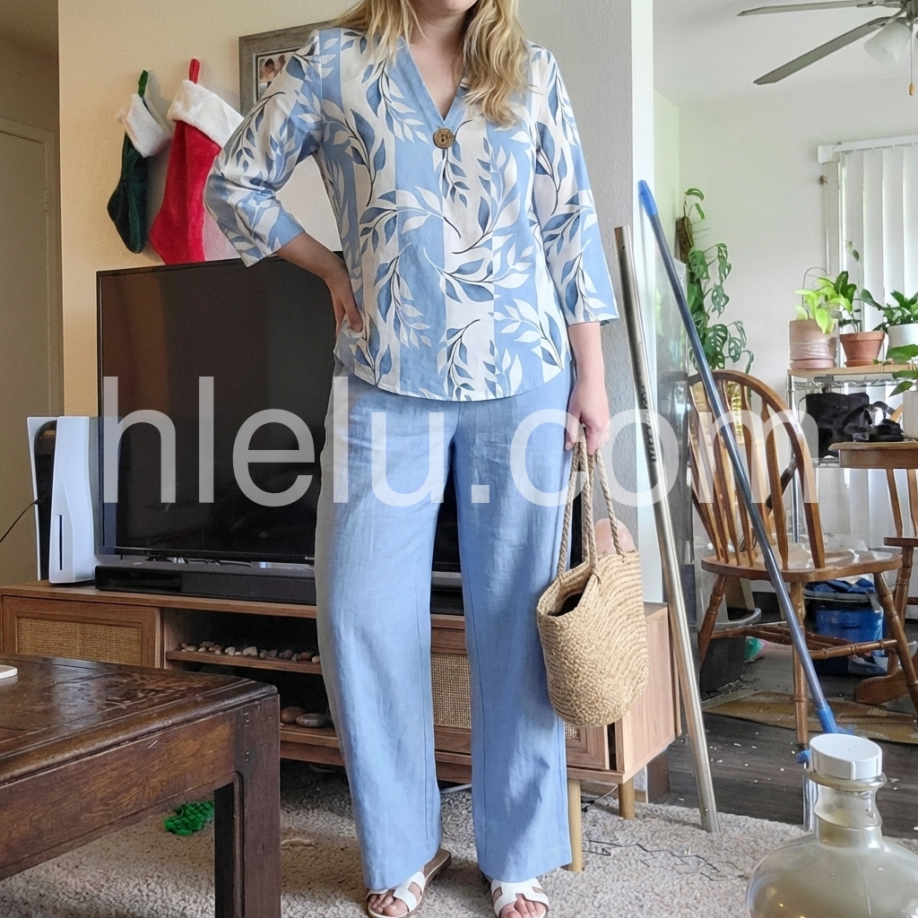 Hey fashionistas! This two-piece set is a total game-changer. The V-neck top with blue and white prints is super flattering, while the three-quarter sleeves add a touch of elegance.