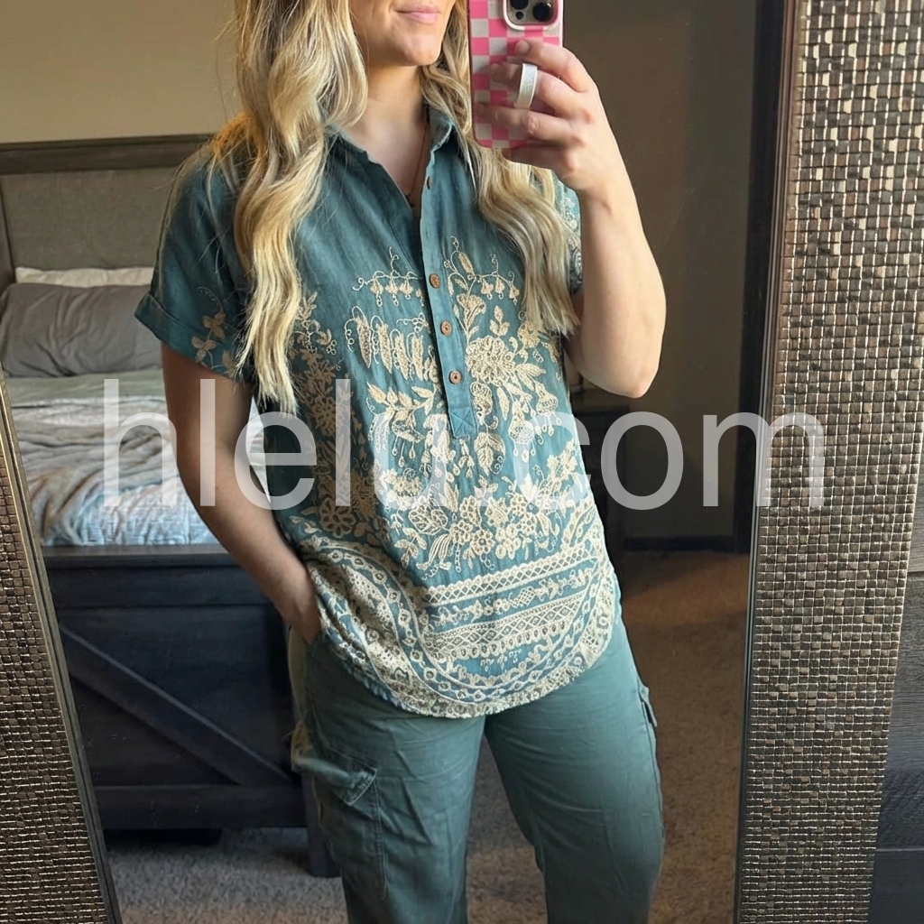 This blouse is a wearable work of bohemian art. The rich teal base, adorned with intricate cream floral and border embroidery, makes a striking statement.