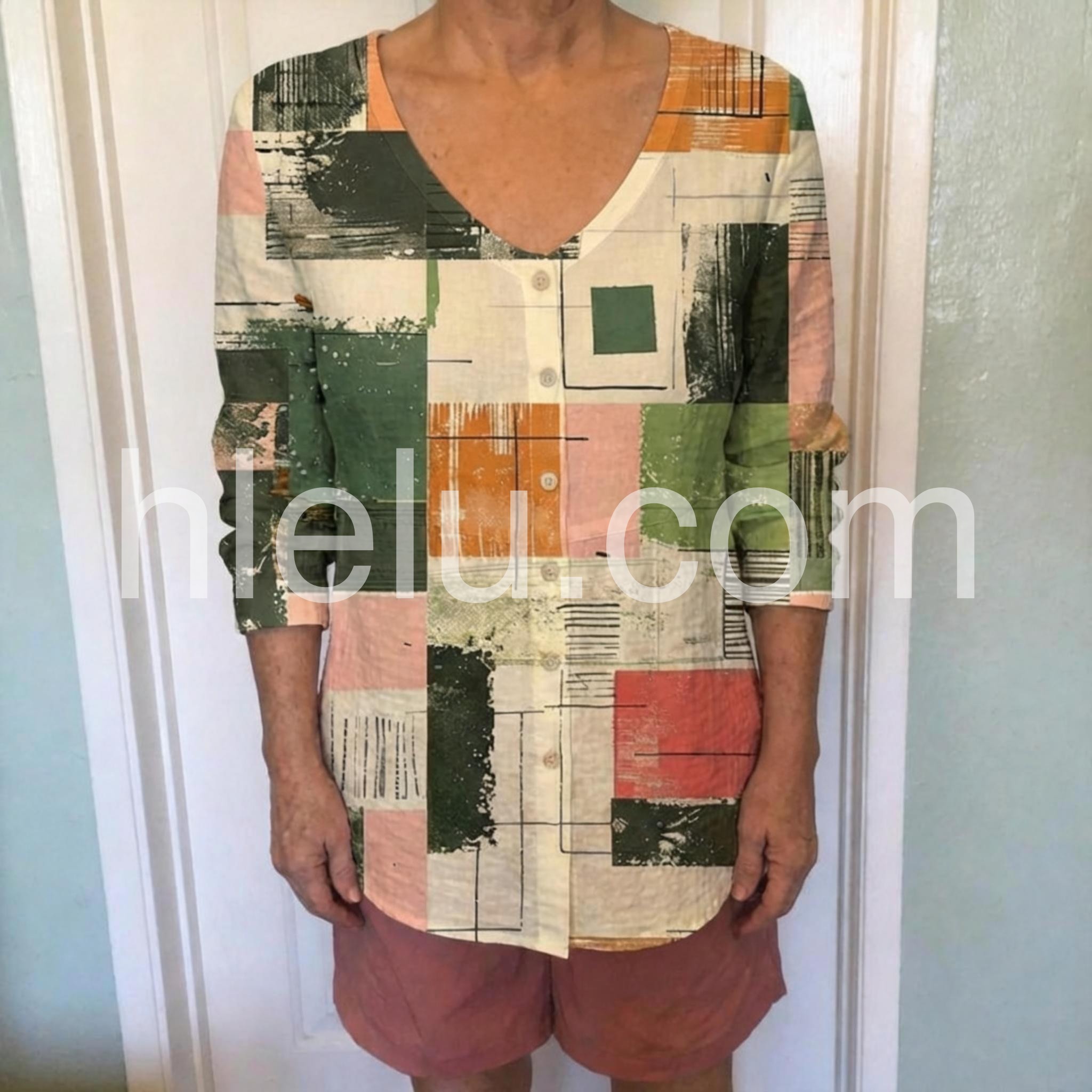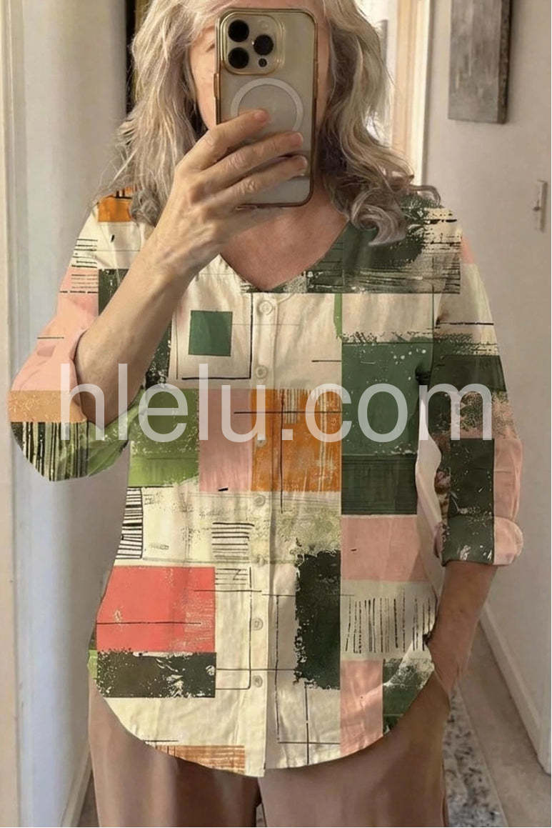 Make a bold artistic statement with this Modern Abstract Patchwork Print Top, a uniquely designed top that blends modern artistry with effortless everyday wear. Crafted from soft, lightweight fabric—likely cotton or rayon blend—this blouse features a vibrant patchwork print composed of geometric blocks and brushstroke textures in soothing earthy tones: sage green, terracotta orange, blush pink, cream, and deep olive, accented with subtle black lines and abstract patterns. The relaxed fit and V-neckline offer a flattering silhouette, while the front button closure adds a classic touch. Styled here with distressed denim and layered jewelry, it’s ideal for weekend outings, creative gatherings, or adding a pop of personality to your daily look.