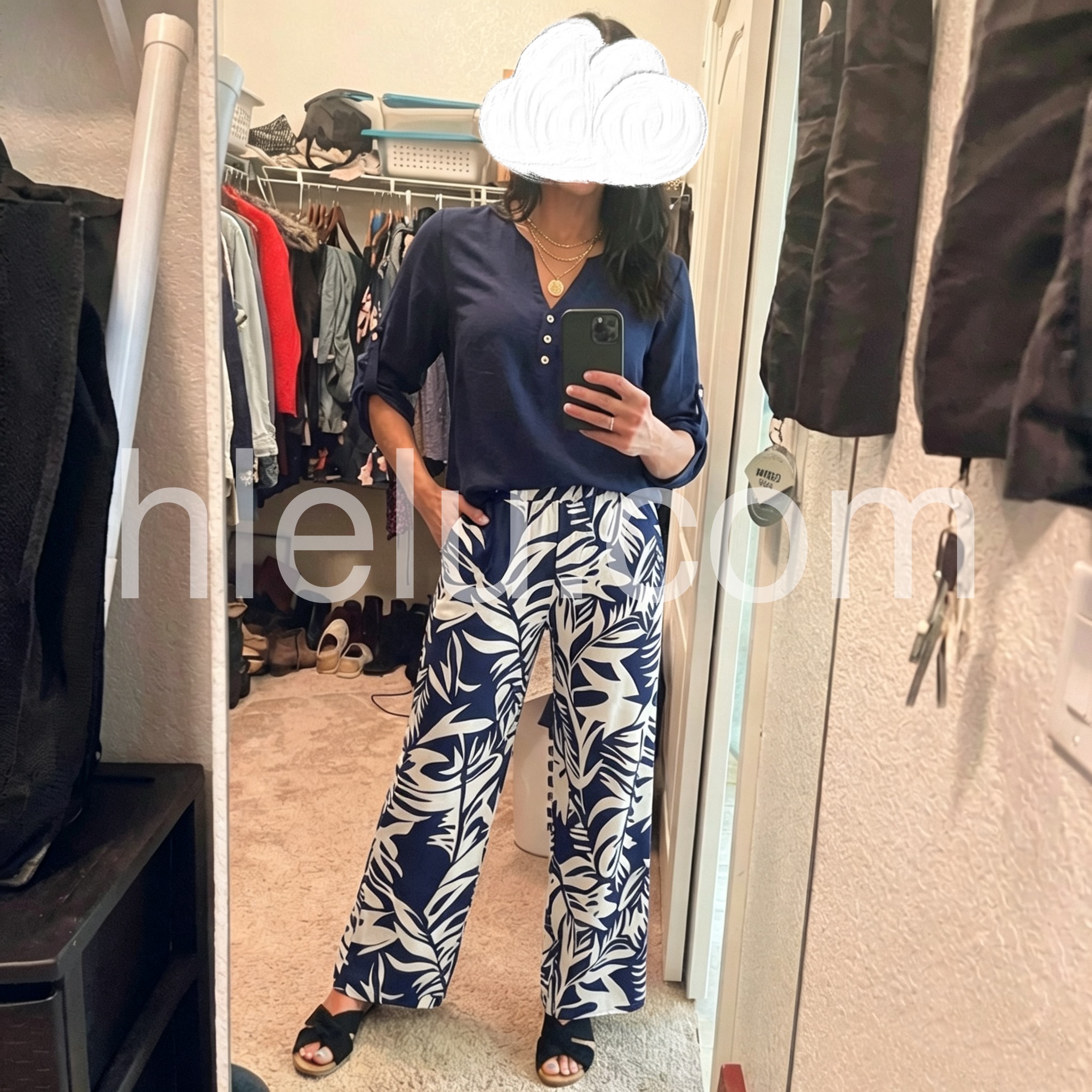 Make a statement with the wide-leg pants, adorned with bold white botanical prints that bring a touch of nature to your look.