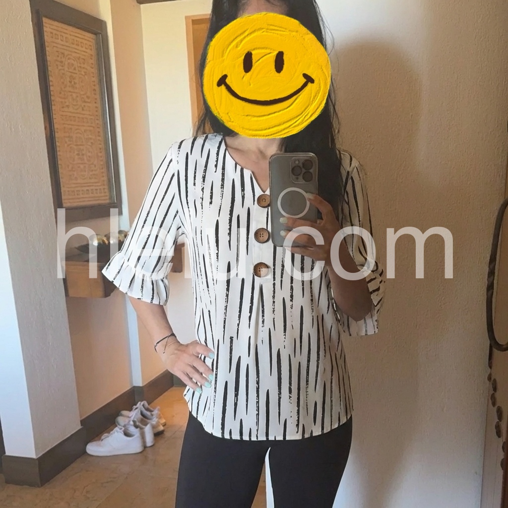 This loose-fitting top features a bold black abstract stripe print on white. V-neckline with wooden buttons down the front. Three-quarter sleeves with ruffled cuffs for a feminine touch. Lightweight and breathable, perfect for casual wear. Easy to pair with jeans or pants.