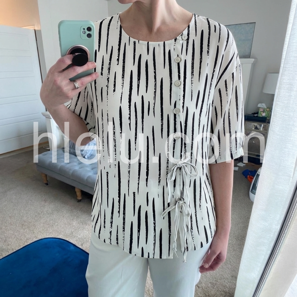 This relaxed-fit blouse features a bold black abstract stripe print on a white base. Round neckline with front button closure and side tie details. Lightweight fabric perfect for everyday wear. Ideal for pairing with jeans or leggings.
