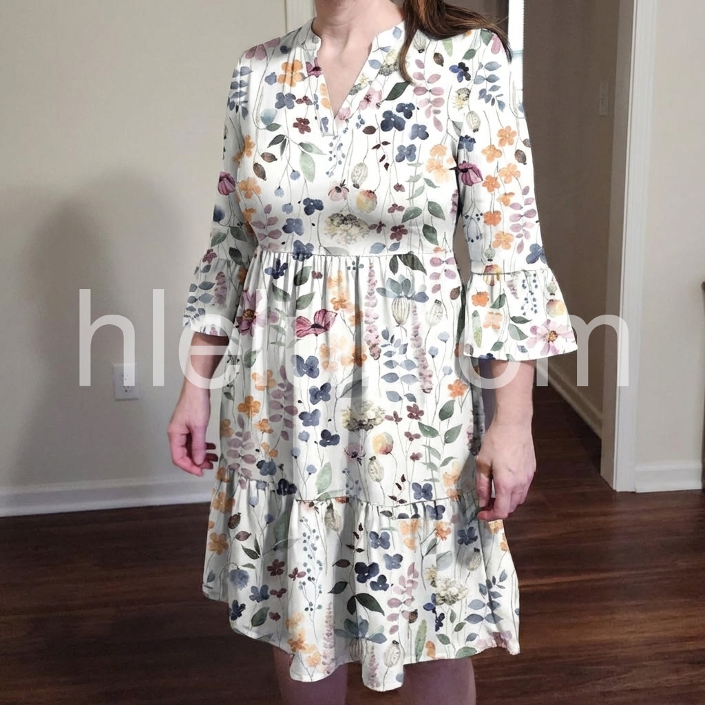 This white floral dress features a V-neck, button-down front, and flared bell sleeves. The tiered skirt adds movement and charm. Soft pastel blooms create a delicate, summery look. Perfect for beach days or casual outings. Lightweight and effortlessly feminine.