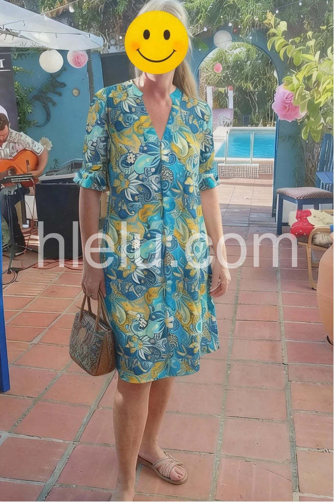 This cheerful and eye-catching summer dress features a bold, tropical-inspired floral print in vivid shades of blue, yellow, and white, creating a lively and festive look perfect for warm weather. Designed with a flattering V-neckline and short sleeves that roll up at the cuffs, it offers both style and comfort. The loose, A-line cut flows gracefully over the body, making it ideal for casual outings, beach days, or vacation adventures. Made from lightweight, breathable fabric, this dress ensures coolness and ease of movement. Pair it with sandals, a straw bag, and sunglasses for a complete bohemian-chic ensemble. Whether you're strolling through the city or relaxing by the sea, this dress brings vibrant energy and effortless charm to any summer wardrobe.