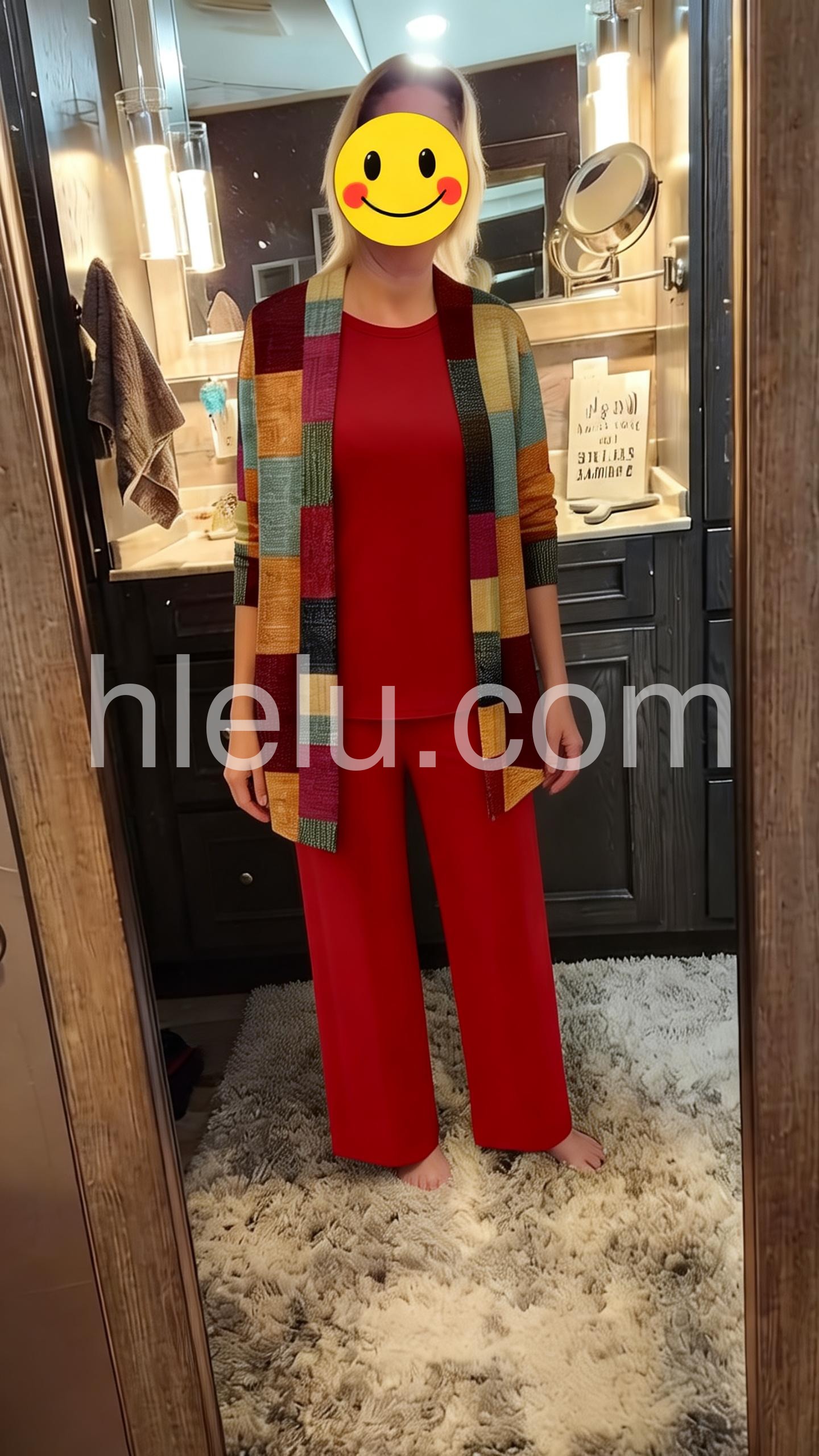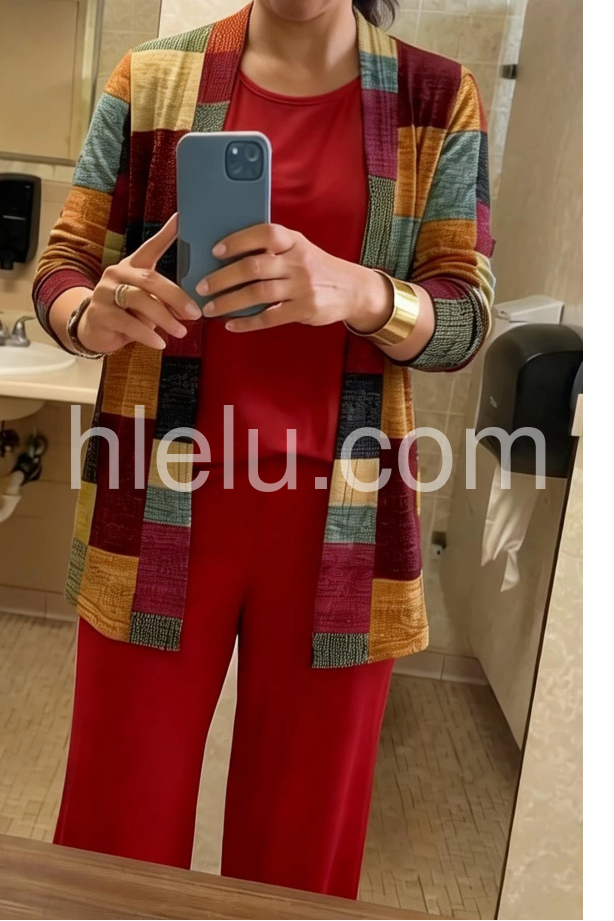 This coordinated outfit features a solid red top and wide-leg pants paired with a vibrant patchwork cardigan. The colorful, geometric design adds a modern touch. Comfortable and chic for casual or semi-formal wear. Perfect for autumn days or stylish outings. Effortlessly elegant with a pop of personality.