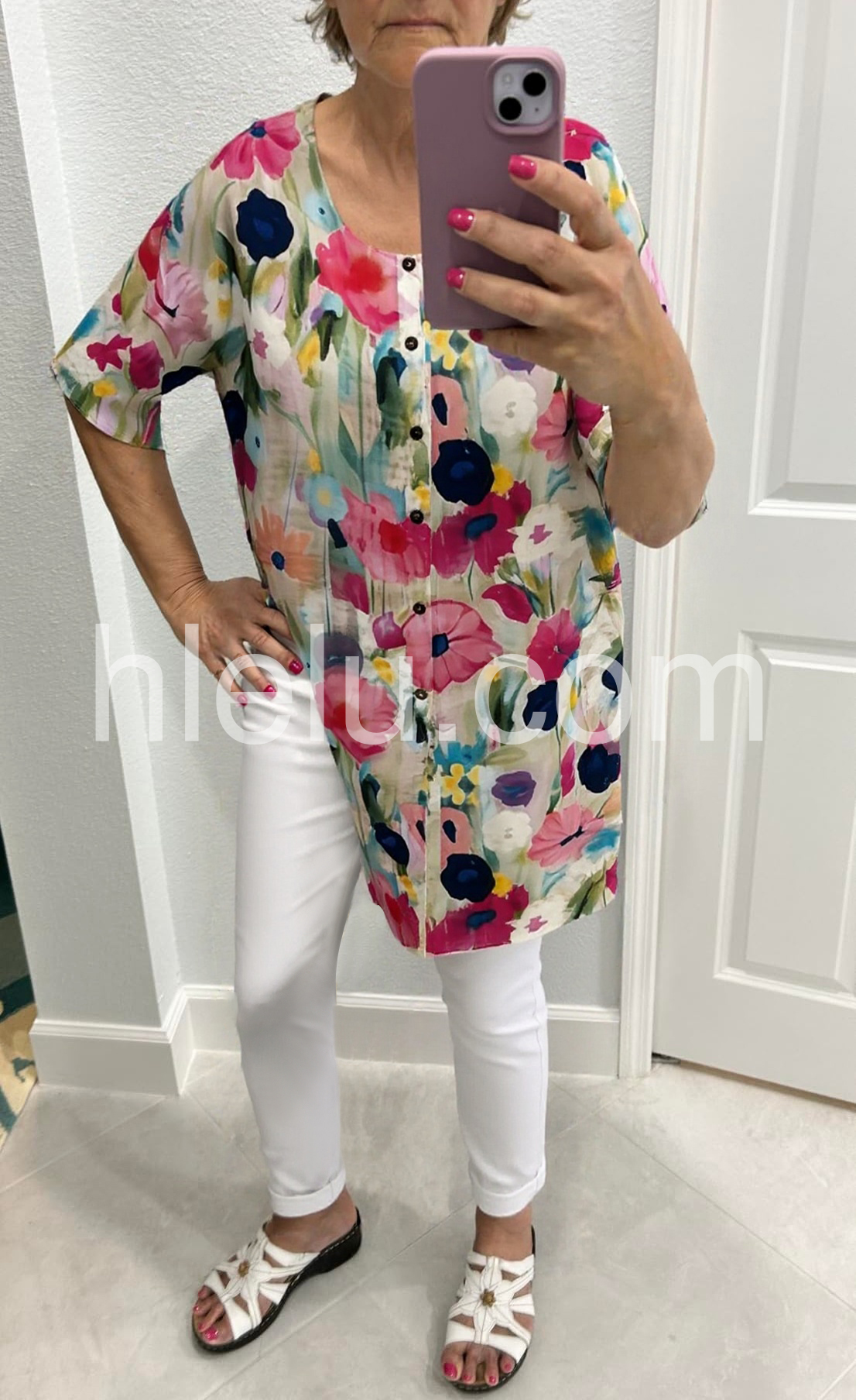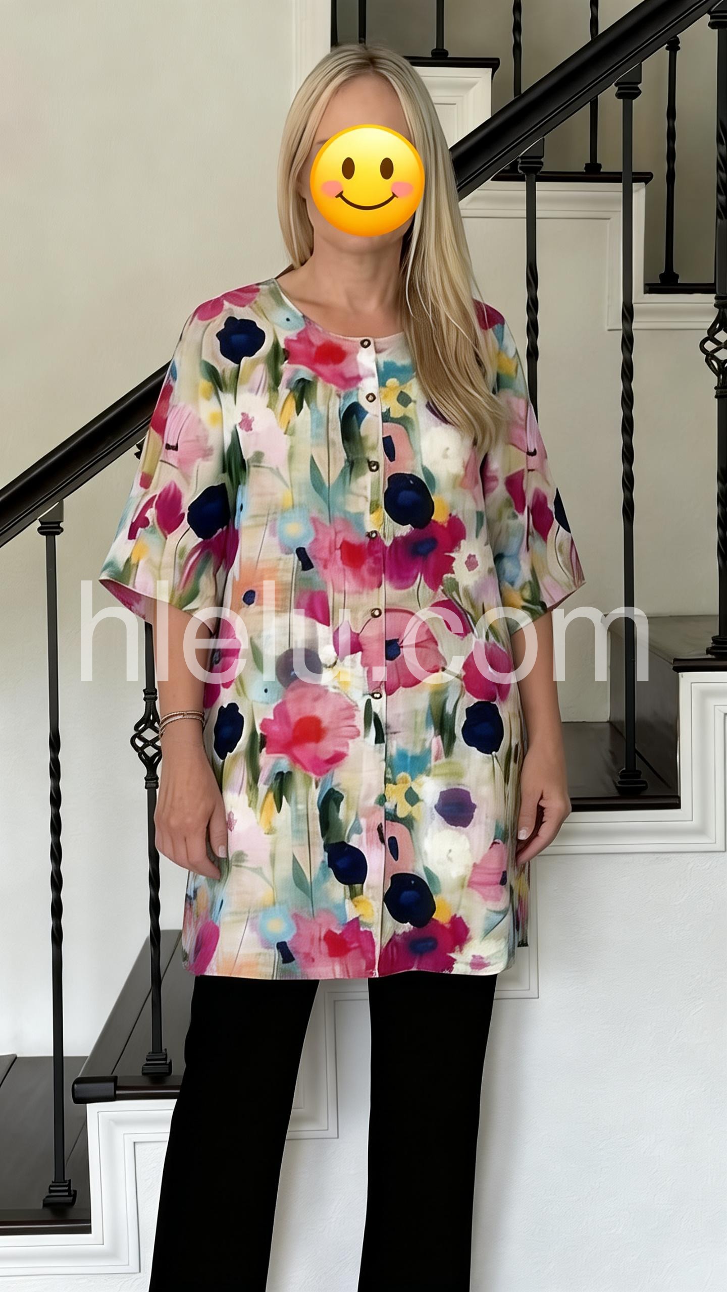 Crafted from a lightweight, breathable fabric, it features a loose, flowy silhouette that flatters all body types. The round neckline and half-length sleeves offer ease of movement, while the front button placket adds a classic, tailored touch. Its eye-catching print bursts with bold blooms in deep red, royal blue, soft purple, and sunny yellow, set against a soft, watercolor-inspired pastel base—evoking a cheerful, garden-fresh vibe.
