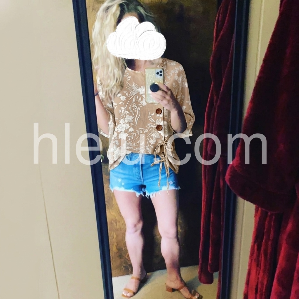This loose-fitting top features a delicate white floral print on a beige background. Round neckline with wooden buttons and side tie detail. Three-quarter sleeves with ruffled cuffs for a feminine touch. Lightweight and breathable, perfect for casual wear. Ideal paired with jeans or pants.