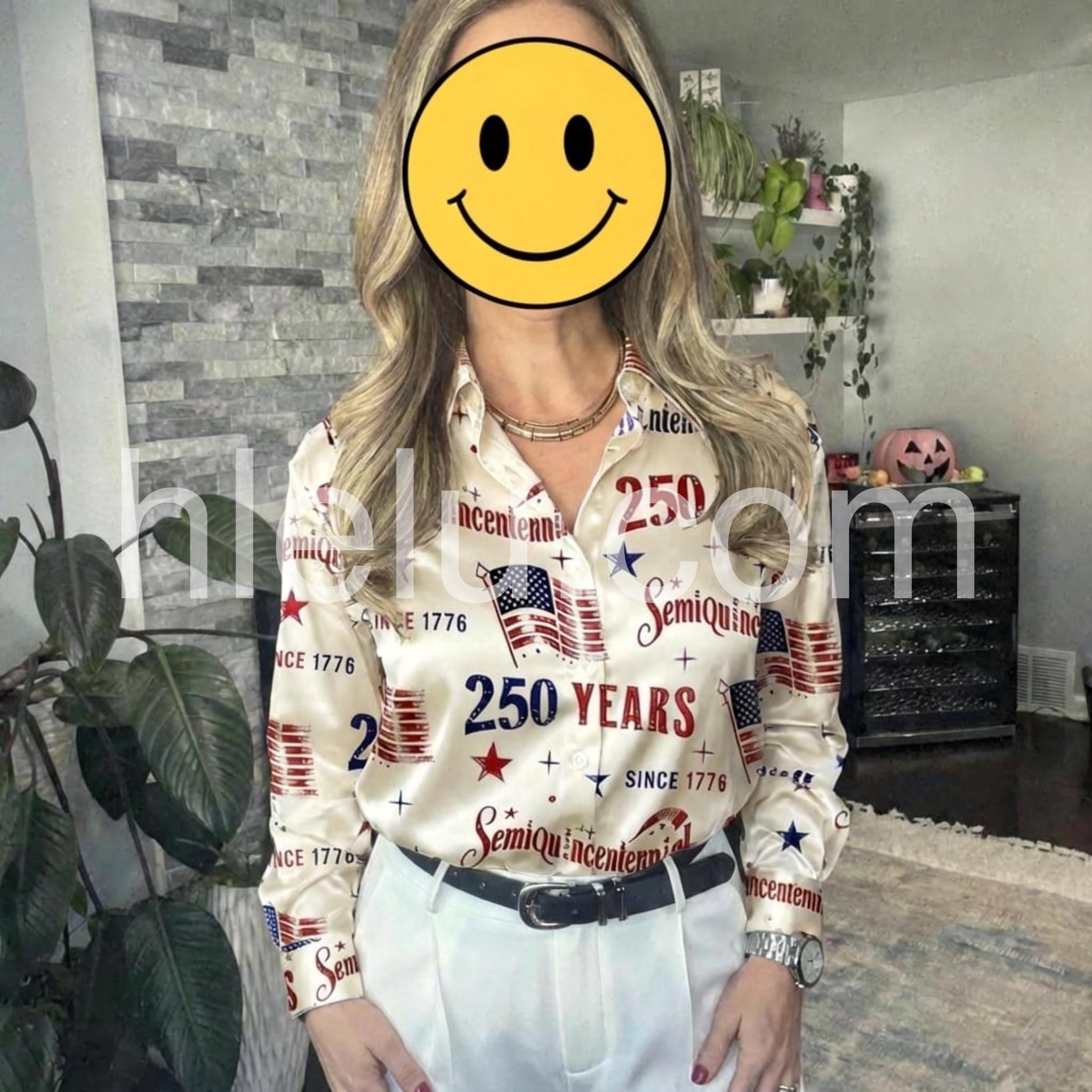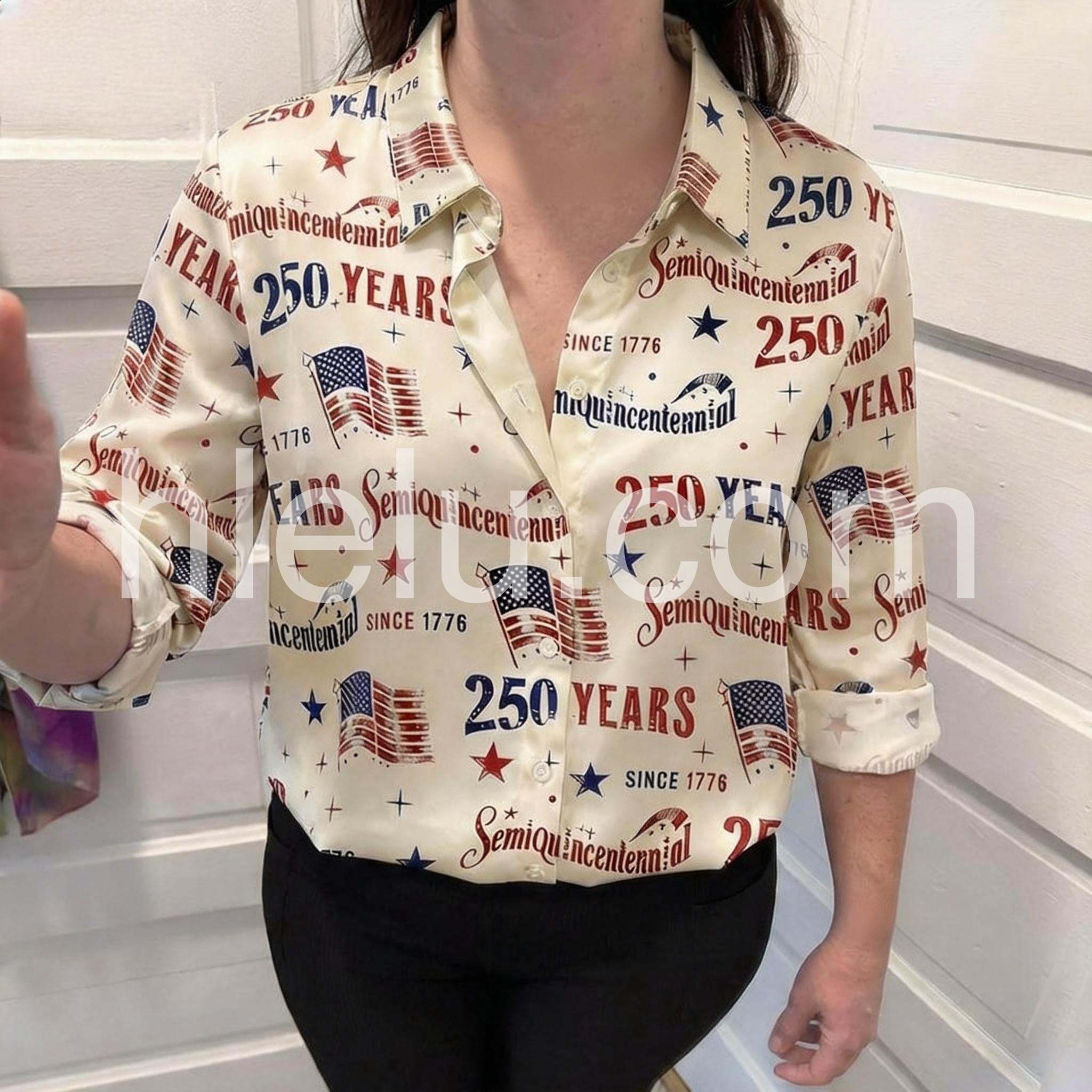 Celebrate the spirit of freedom in this Special Long Sleeve Satin Shirt , a bold and festive top that honors America’s upcoming Semiquincentennial milestone. Crafted from lustrous satin fabric, this long-sleeve blouse features a striking all-over print celebrating 250 years since 1776, with vibrant red, white, and blue accents including American flags, stars, and celebratory text like “Semi-Quincentennial” and “250 YEARS.” The classic button-down front and deep V-neckline offer a flattering, slightly edgy look, while the soft drape adds elegance and movement. With rolled-up sleeves and a relaxed fit, it’s perfect for pairing with dark denim jeans, white pants, or a high-waisted skirt—ideal for Fourth of July festivities, patriotic events, or summer celebrations.