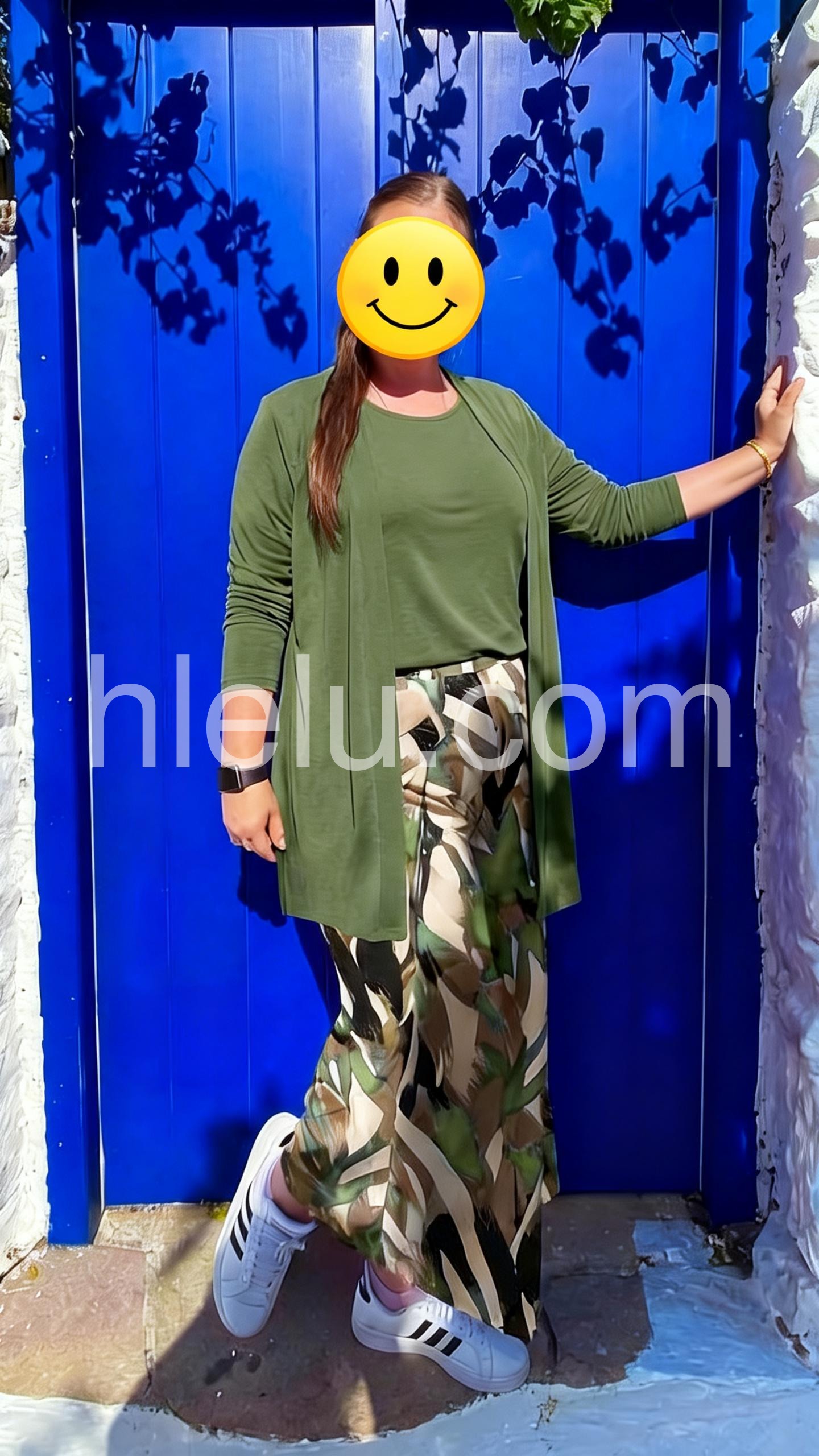 This three-piece set features a solid green top, matching open-front cardigan, and wide-leg pants with a bold tropical leaf print. The relaxed silhouette offers comfort and style. Perfect for casual outings or warm-weather wear. Lightweight fabric ideal for everyday elegance. Effortlessly chic and easy to wear.