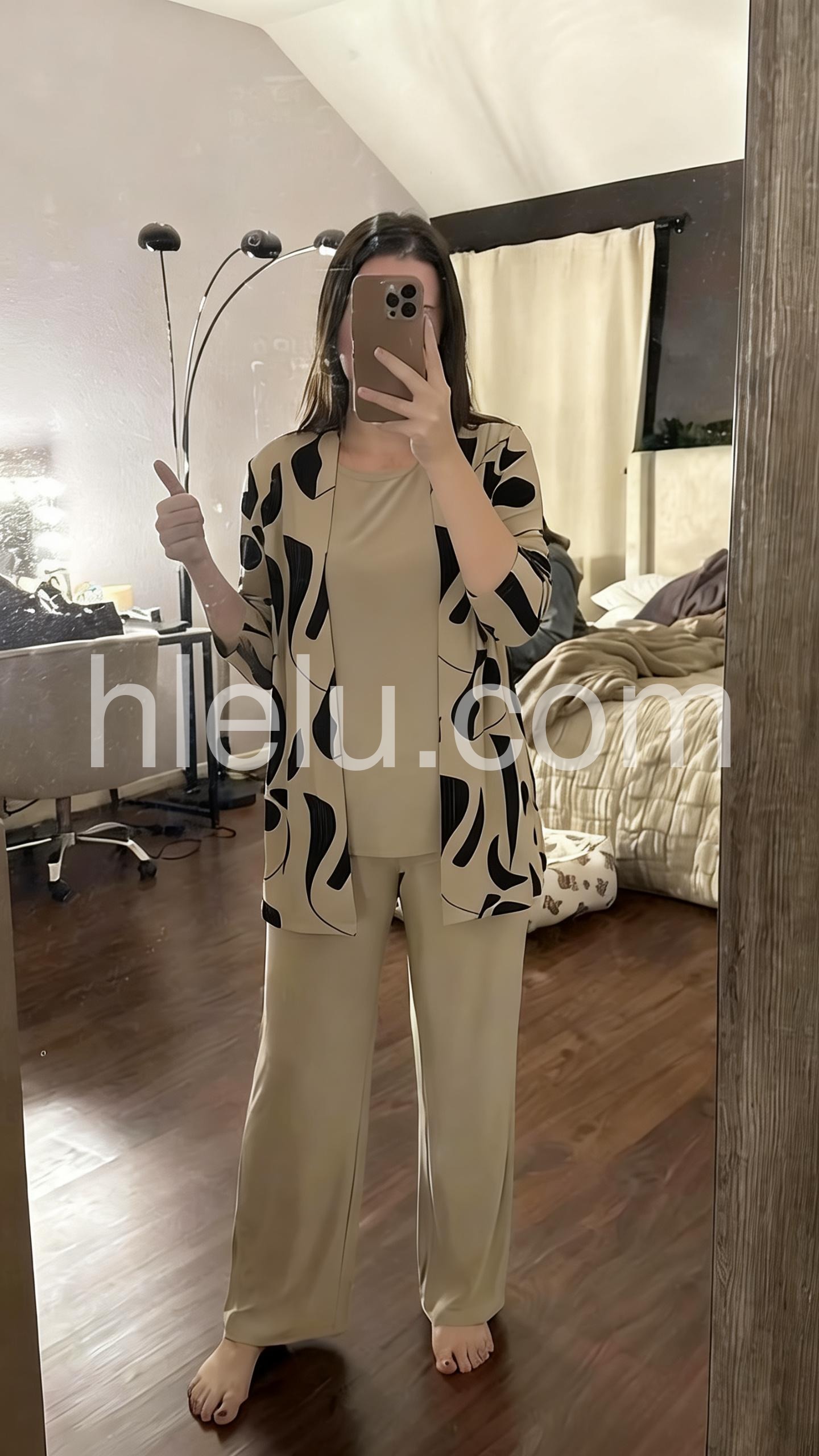 This coordinated set includes a round-neck top, relaxed wide-leg pants, and a matching open-front cardigan in soft brown tones. Made from comfortable, lightweight fabric ideal for everyday wear. The minimalist design offers effortless elegance. Perfect for casual outings or relaxed days at home. Stylish, versatile, and easy to layer.