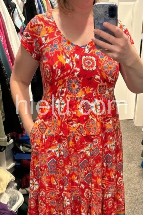 Make a bold statement with this vibrant red boho dress. The intricate ethnic print, tiered skirt and pockets add playful, cultural charm.