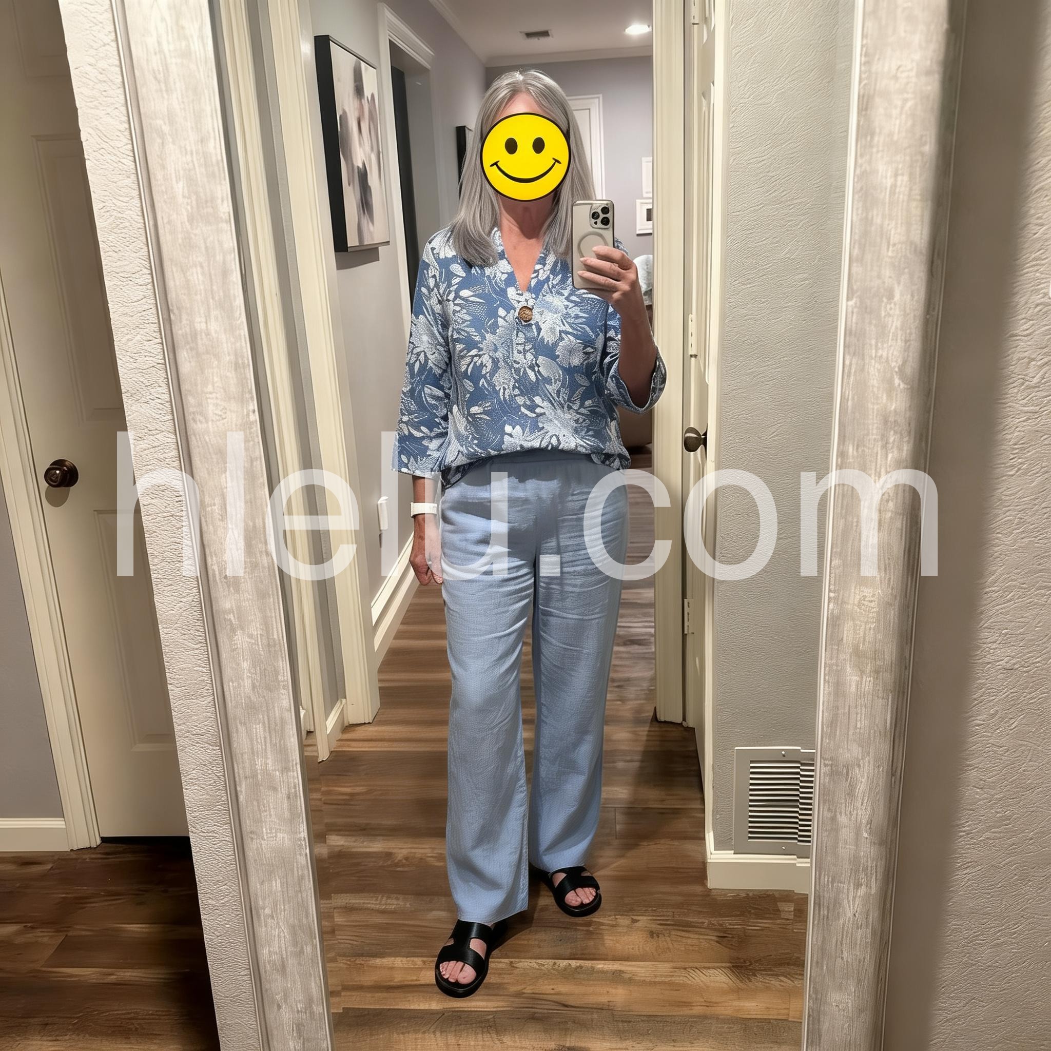 This lightweight two-piece set features a floral-print blouse with a V-neck and single button closure. Paired with relaxed-fit wide-leg pants in soft blue. Breathable fabric perfect for warm weather. Ideal for beach walks or casual summer days. Effortlessly stylish and breezy.