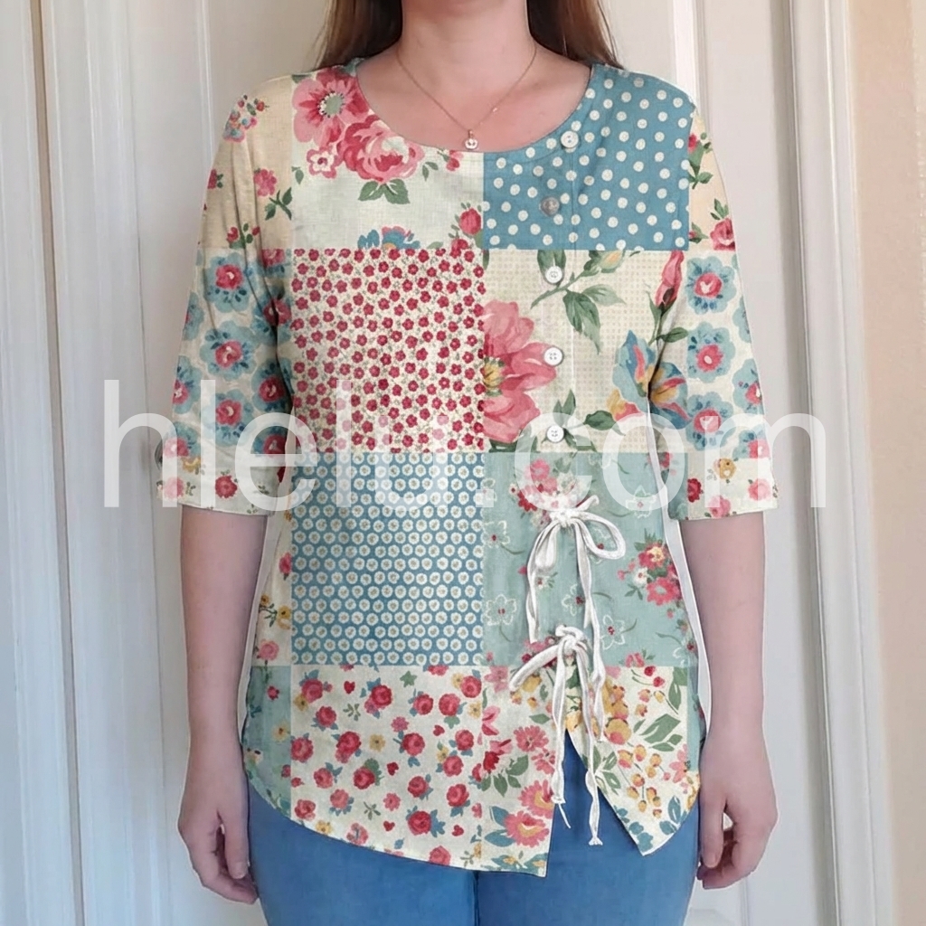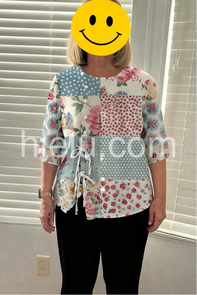 This loose-fitting top features a charming patchwork design with floral and polka dot patterns. Rounded neckline with front buttons and side drawstring for a relaxed fit. Short sleeves and asymmetrical hem add style. Lightweight and perfect for casual wear. Ideal for spring and summer days.