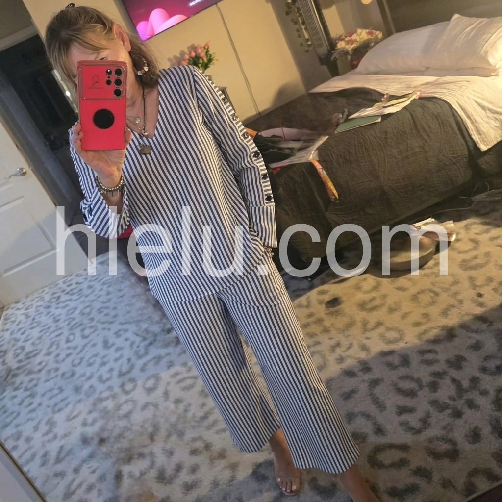 This coordinated set features a relaxed V-neck top and wide-leg cropped pants in classic blue and white stripes. The long sleeves with decorative side buttons add a stylish detail. Lightweight fabric perfect for warm weather. Ideal for casual outings or smart-casual events. Effortlessly elegant and easy to wear.
