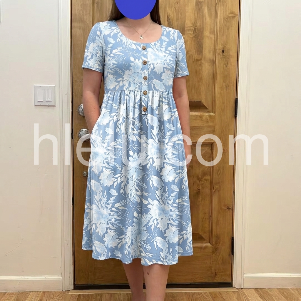 Blue Floral Button-Front Midi Dress with Pockets
