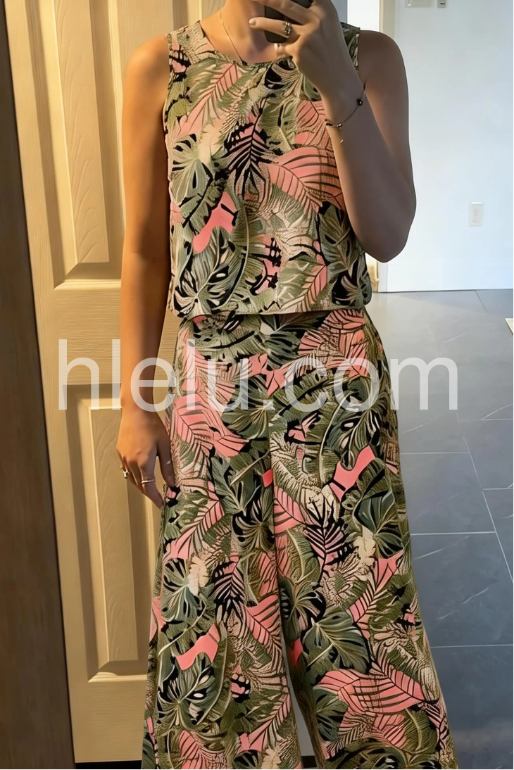 This coordinated set features a sleeveless crop top and wide-leg pants in a bold tropical leaf print. The mix of green, pink, and black creates a lively summer vibe. Lightweight fabric for comfort and ease. Perfect for beach days or casual outings. Effortlessly stylish with a nature-inspired flair.
