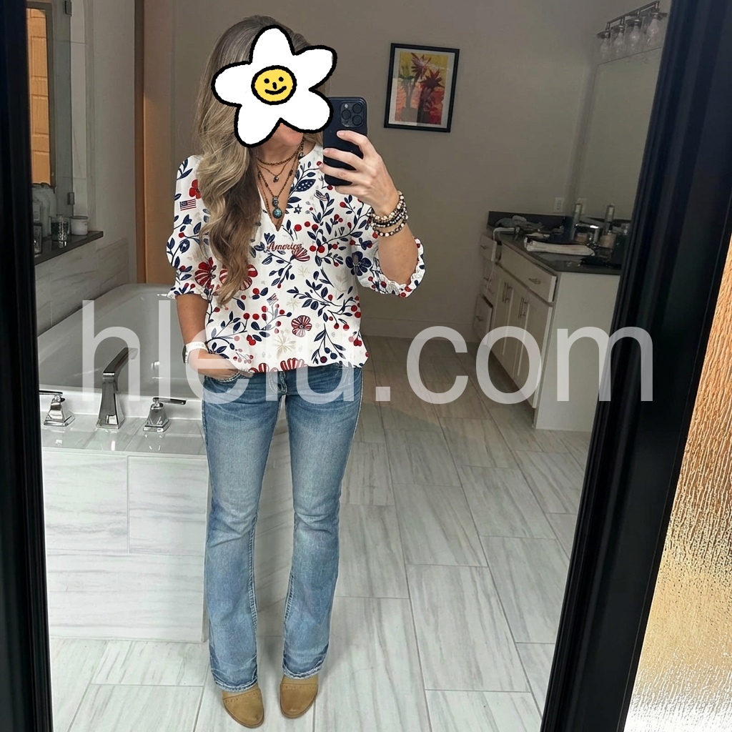This patriotic floral blouse is perfect for Fourth of July! The red, white, and blue flowers are so fun, and the “America” print is a cute touch.