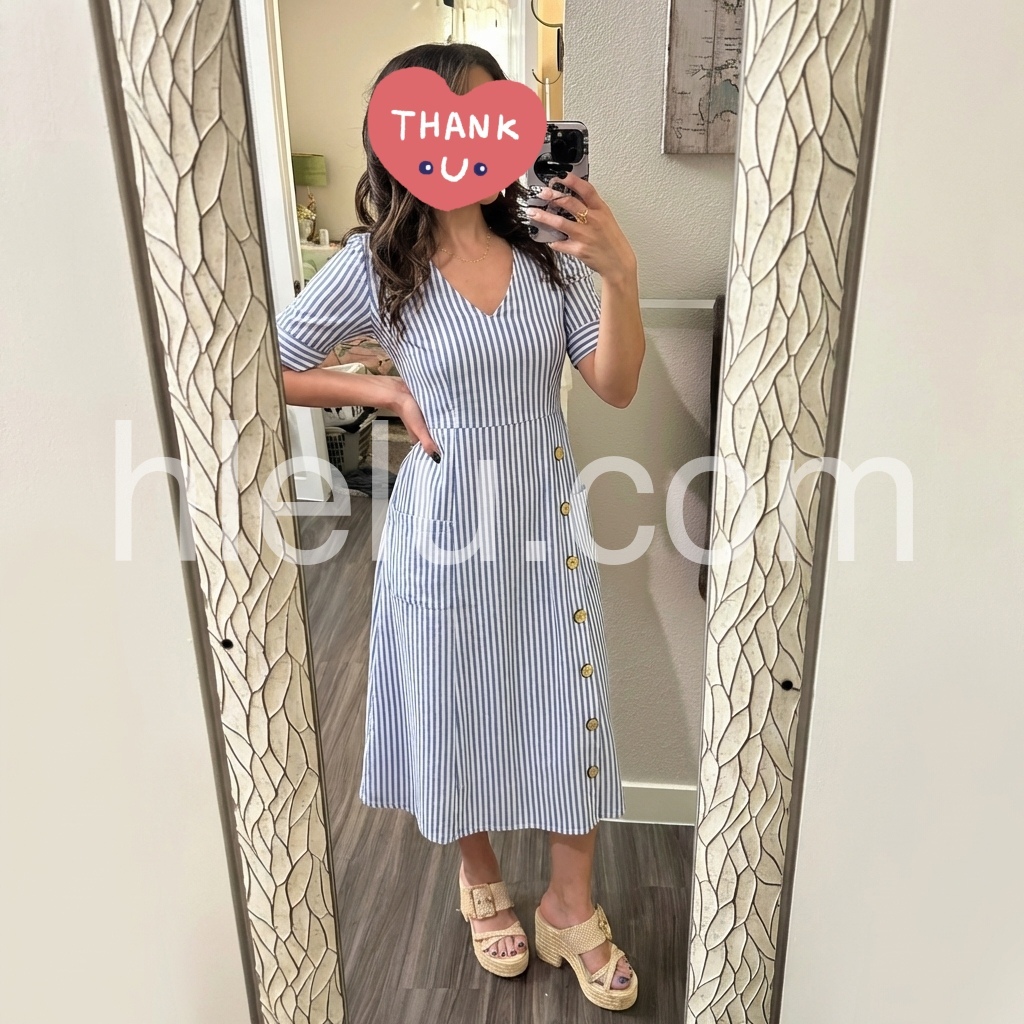 This midi dress reimagines classic nautical stripes with modern, feminine style. The crisp blue-and-white print and V-neck create a timeless, fresh look.