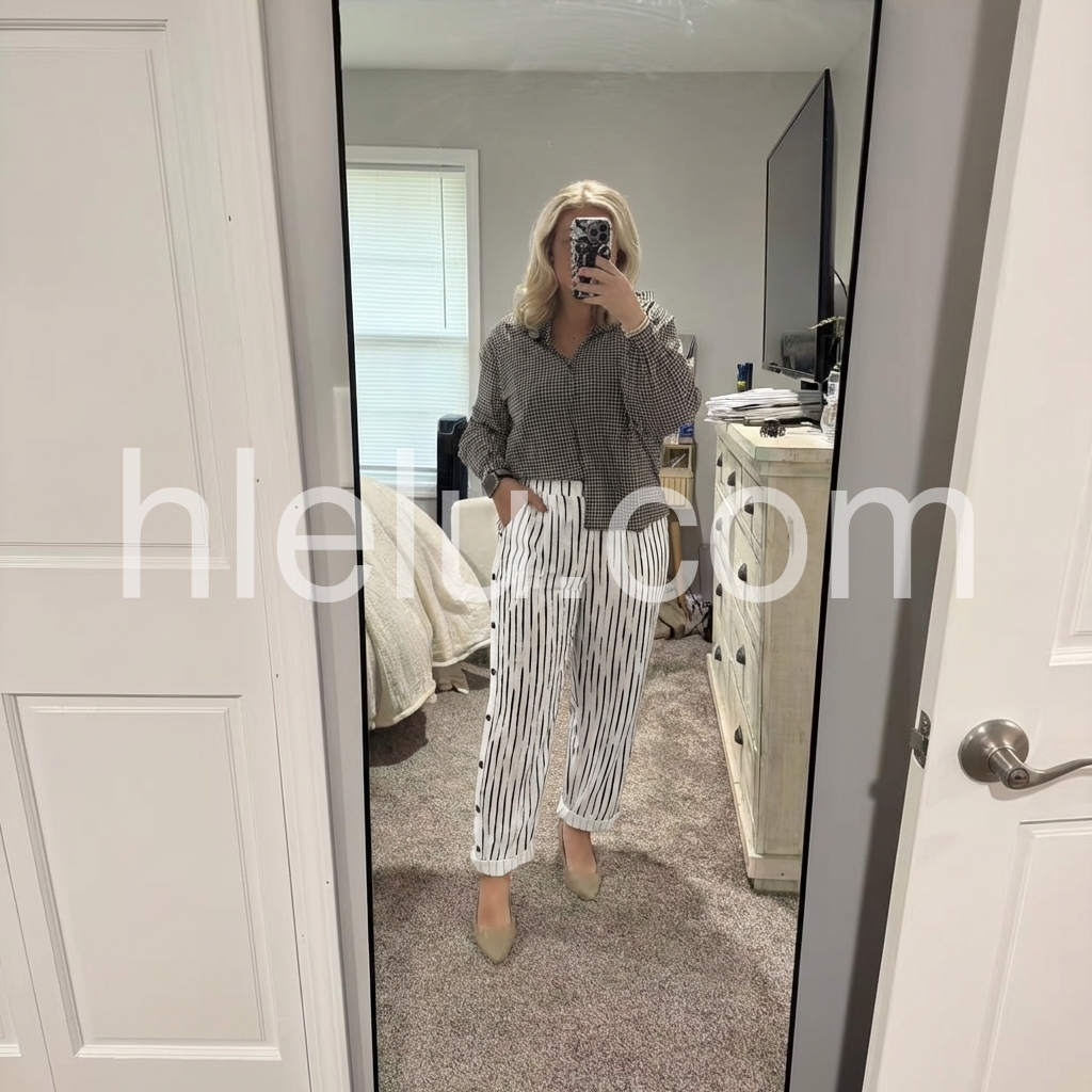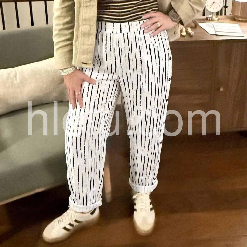 These loose-fit pants feature a modern black abstract stripe print on a white base. Side button details add a unique touch. Elastic waistband and cuffed hems for comfort. Perfect for casual outings or beach days. Effortlessly chic with a relaxed silhouette.