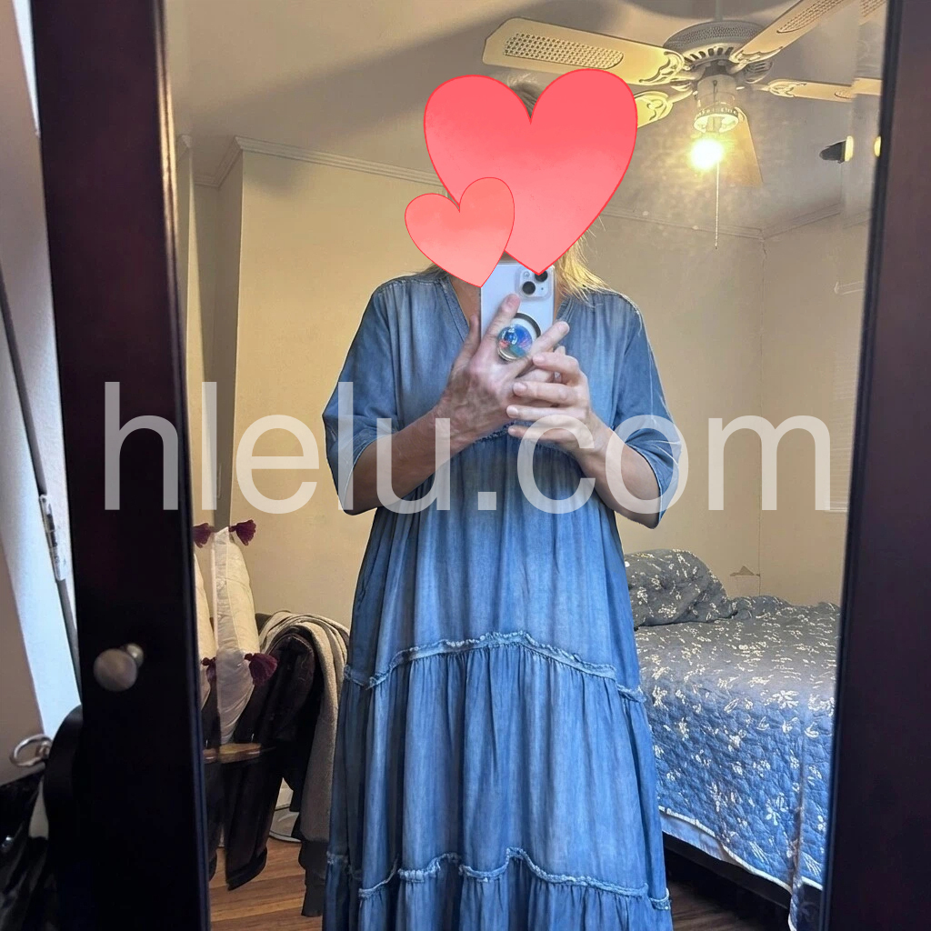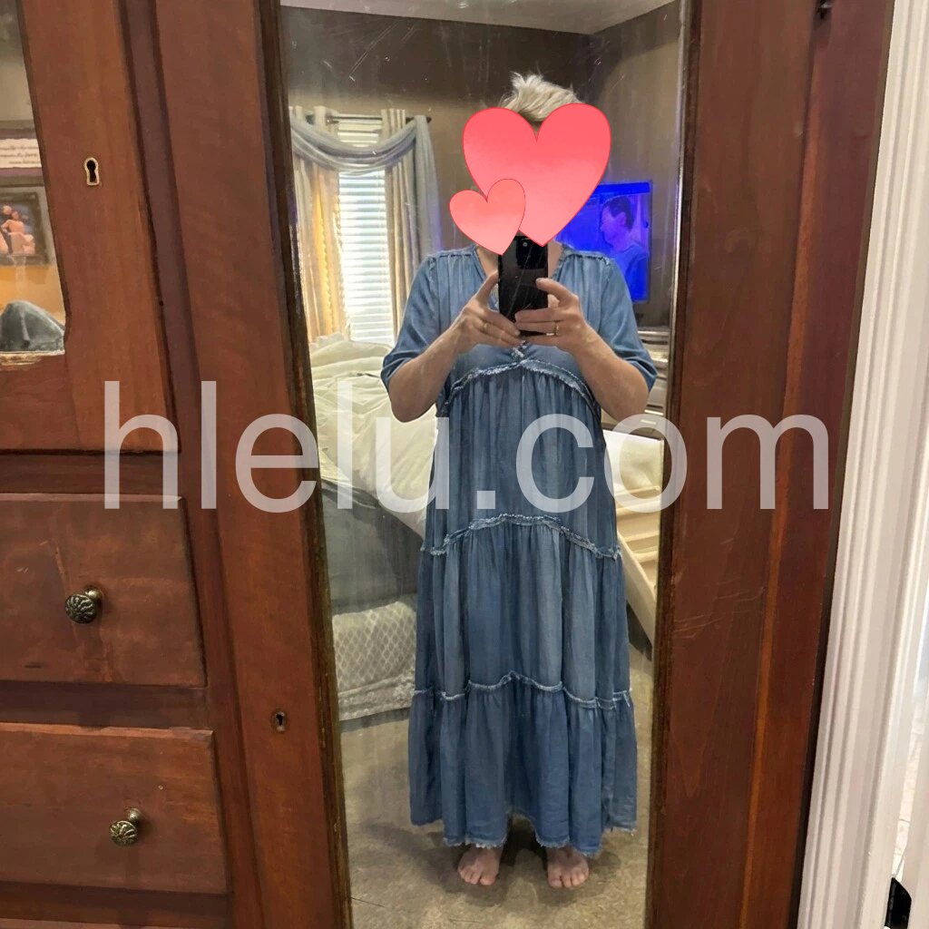 Blue Denim Plain 3/4 Sleeve Maxi Dress