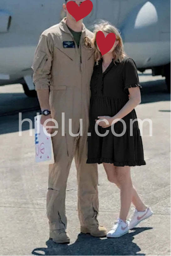 Elevate your everyday look with this Black Tiered Ruffle Short Sleeve Mini Dress, a charming and feminine silhouette that blends timeless elegance with modern comfort. Crafted from soft, lightweight fabric—likely satin or crepe—with a subtle sheen, this mini dress features a flattering V-neckline adorned with delicate ruffles that add a touch of romance and detail. The short flutter sleeves are finished with matching ruffled edges, enhancing the dress’s playful yet sophisticated vibe. A tiered skirt design creates gentle volume and movement, making it perfect for casual outings, brunch dates, or relaxed social gatherings. The mid-length hem offers versatility, while the flowy fit ensures ease and comfort all day long. Paired here with a statement necklace and a structured tote, it strikes the perfect balance between chic and effortless. Whether you're running errands or meeting friends for coffee, this black dress brings grace, style, and understated glamour to any occasion.
